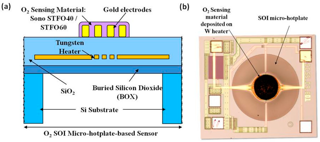 (a) O2 resistive sensor structure employing a CMOS-compatible SOI micro-hotplate as substrate and Sono-STFO40 as sensing layer; (b) Top-view of the manufactured O2 resistive sensor.