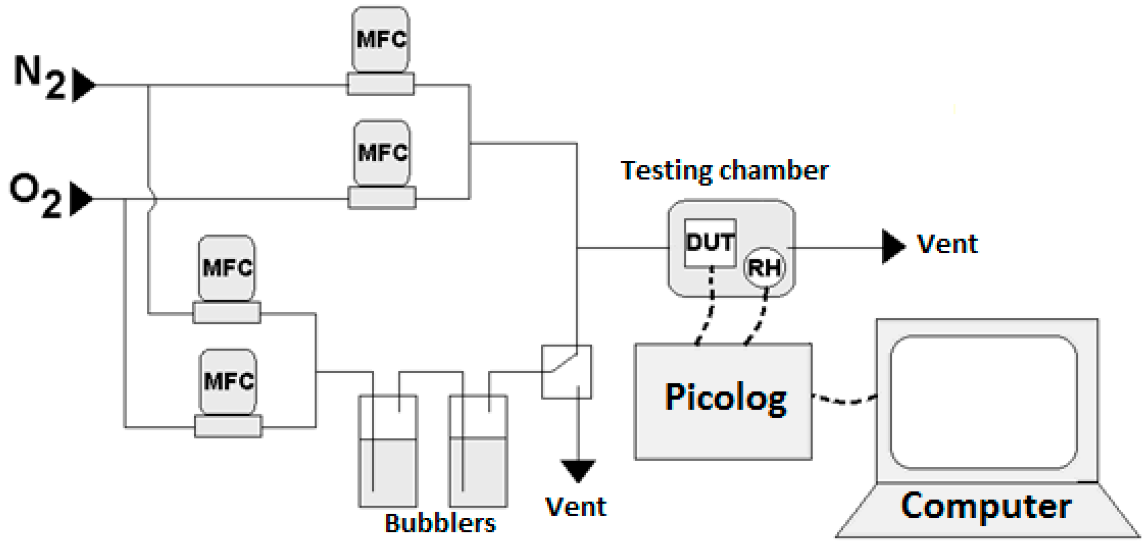 Figure 2. The setup comprises a small testing chamber (5 mm × 5 mm × 5 mm) with gas inlet/outlet and electrical connections, a system of mass flow controllers (Brooks MFC 4800 Series), two glass bubblers (for relative humidity (RH) control), a PicoLog and a computer for data readout. The oxygen sensor was encapsulated in a TO-5 package (shown as device under test (DUT) in