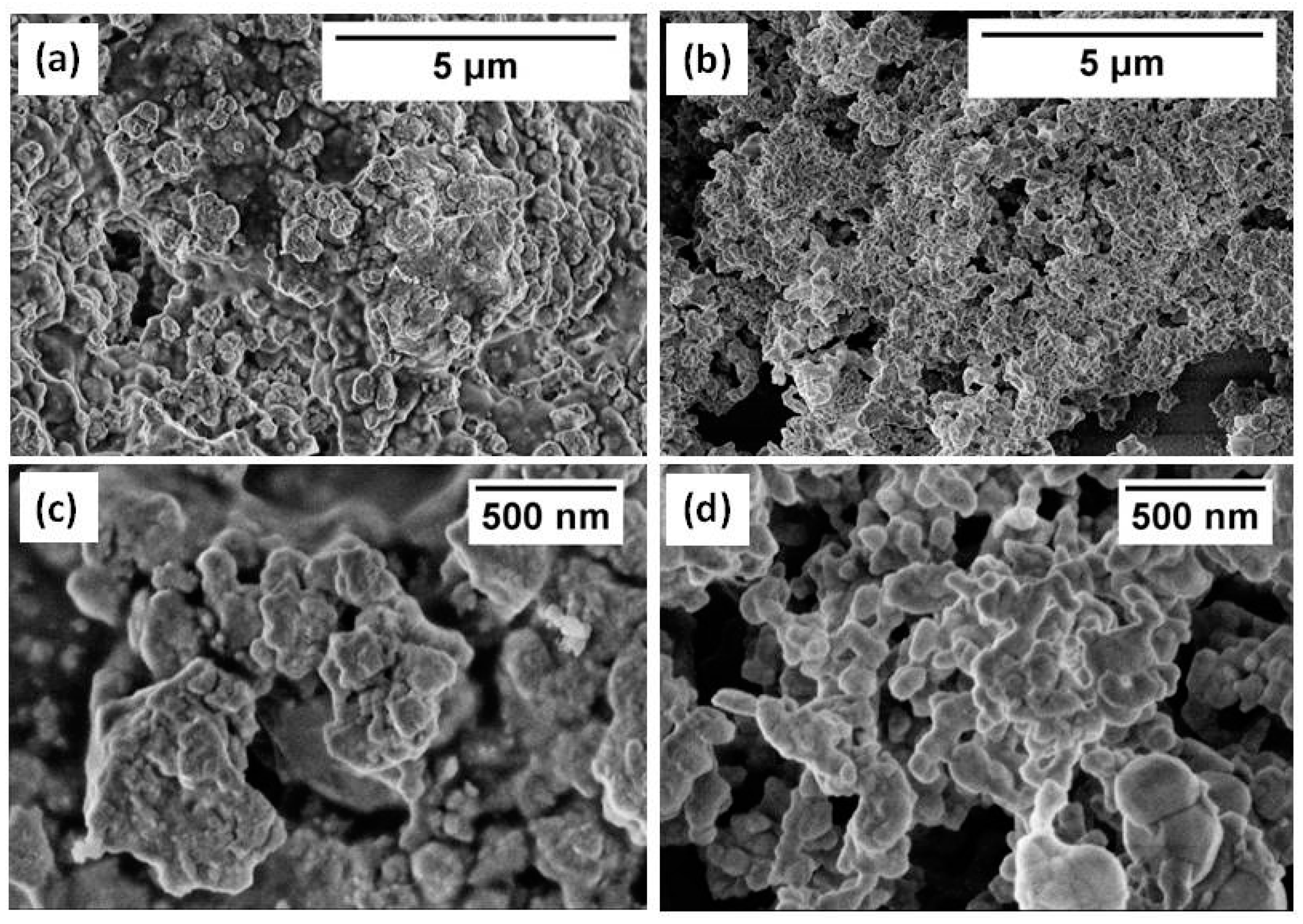 SEM micrographs of (a) commercial STFO60 (10 kX); (b) Sono-STFO40 (10 kX); (c) commercial STFO60 (50 kX); (d) Sono-STFO40 (50 kX).