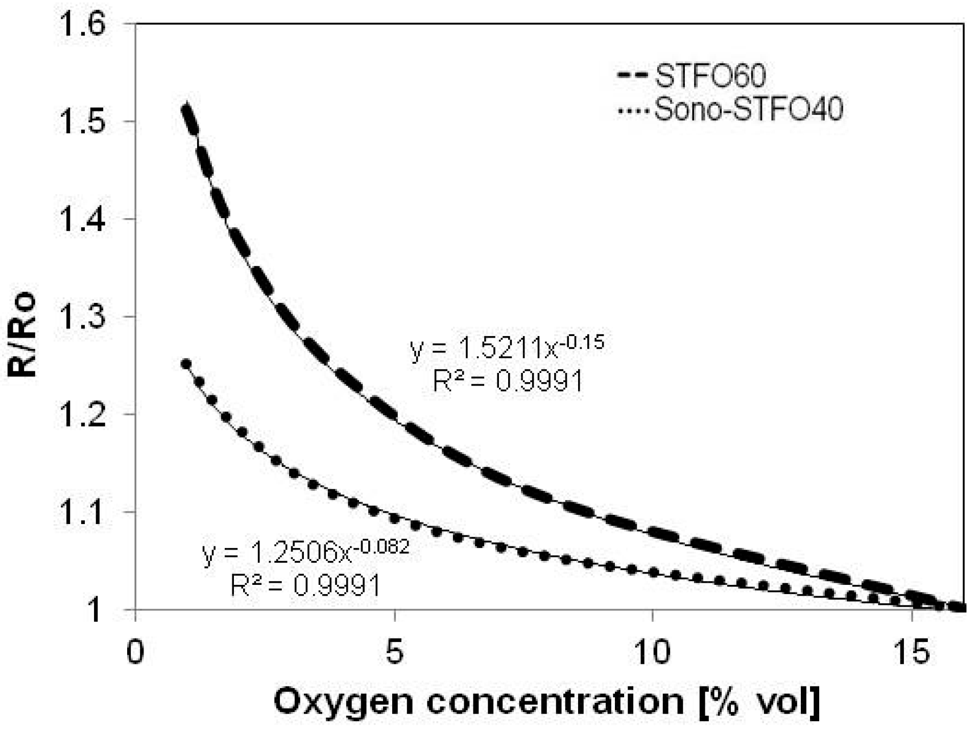 Normalized resistance vs. oxygen concentration for both Sono-STFO40 and STFO60.