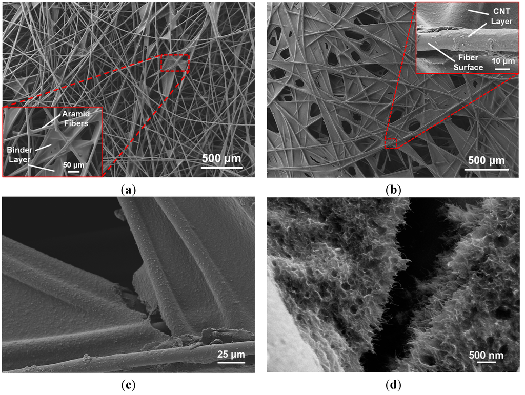 SEM micrographs showing (a) non-woven aramid fabric with binder (insert), (b) aramid fabric with CNTs deposited onto the fiber surface (inset), (c) fiber cross-over region with nanotubes uniformly coating the binder and fibers with (d) a high-magnification image showing the CNT coating.