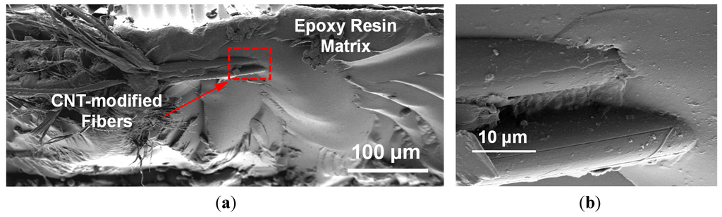 Figure 6a shows a fracture surface of the fabric/epoxy composite after resin infusion where three fibers are seen protruding from the polymer matrix. It can be seen that the nanotube-based sensor has a low fiber volume fraction overall. From the higher-magnification view in the region of the nanotube-modified fibers in Figure 6b, strong wetting between the coated fibers and the polymer matrix is observed.
