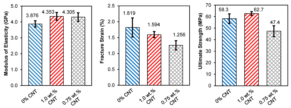 Mechanical properties of the aramid/epoxy composite (=0% CNT) and the CNT composite sensors (=1.0 and 0.75 wt %) (error bars represent one standard deviation).