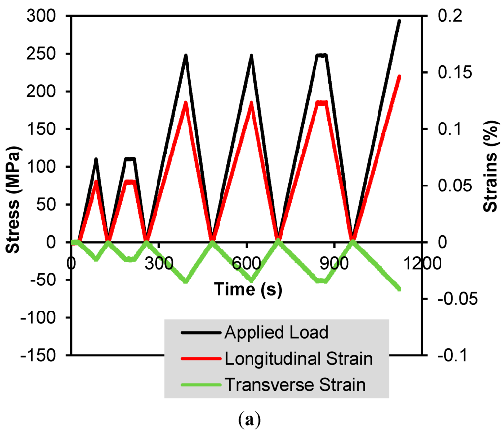 Case Study 1: Sensors on a steel bar—to investigate the sensing capability of the CNT composite sensors in the longitudinal and transverse directions, four sensors were distributed on a steel (ASTM A572 Grade 50) dogbone-shaped tensile bar (dimensions: 432 × 64 × 5 mm) with a neck area of 229 × 38 mm. These sensors are composed of the aramid nonwoven fabric processed with 1.0 wt % CNT loading and adhered along the longitudinal centerline of the steel bar using epoxy resin (EPON® 862) with a curing agent (EPIKURE 3223). In accordance with the sensor size as well as the electrical current sourcing direction between the electrodes, these sensors are referred to as Sensor 1-1-L, 1-1-T, 0.3-1-L and 1-0.3-T as shown in Figure 4a. Specifically, Sensor 1-1-L and Sensor 1-1-T are 25.4 × 25.4 mm (i.e., aspect ratio = 1) and their electrical measurements are made in the longitudinal and transverse directions, respectively. Similarly, Sensor 0.3-1-L and Sensor 1-0.3-T are 9.5 mm in the x-direction and 31.8 mm in the y-direction; they are monitoring the axial strain in the longitudinal direction and the transverse strain due to the Poisson contraction, respectively. A 350 Ω bi-axial stain gage (0°/90° pattern, Micro-Measurements®) with a gage length of 6.4 mm was used to measure the strains in both principal directions. The steel specimen was then subjected to a quasi-static loading protocol using an Instron 8562 (Instron, Norwood, MA, USA) servo-hydraulic load frame. The displacement-controlled loading protocol included five continuous load-unload cycles: two to 110 MPa and three to 248 MPa using a displacement rate of 0.5 mm/min and an unloading rate of 0.8 mm/min. During the second and fifth loading cycles, the stress was maintained for 30 s to examine any transient effects. The test was discontinued at a peak load corresponding to 300 MPa.