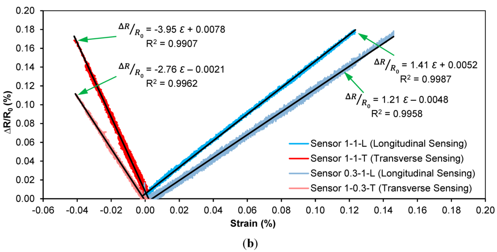 Figure 10a shows the mechanical response of the steel specimen (Specimen 1) subjected to a longitudinal tensile stress as well as its transverse strain response due to the Poisson contraction. It can be seen that this specimen deforms elastically under the applied loading. The corresponding sensing responses of the four CNT composite sensors are displayed in Figure 10b. All show a strong linear response where the piezoresistivity of Sensors 1-1-T (GF = −3.95) and 1-0.3-T (GF = −2.76) in the transverse direction is higher compared to Sensors 1-1-L (GF = 1.41) and 0.3-1-L (GF = 1.21) in the longitudinal direction. Although the strain in the transverse direction is compressive, the resistance of the sensing increases, resulting in a negative gage factor. Unlike a traditional strain gage, the CNT network is random and shows sensitivity to both transverse and longitudinal strain. At the nanoscale there are changes in tunneling gaps associated with both transverse and tensile strains in the sensor. In this case the longitudinal strain is much higher than the transverse strain. As a consequence, the net increase in the electrical tunneling gaps is dominated by the strain in the longitudinal direction resulting in an increase in resistance in both directions. In addition, under the same strain field, longer conductive pathways along the longitudinal strain direction attract more changes in CNT-to-CNT tunneling gaps, which result in the higher strain sensitivity in Sensor 1-1-L than Sensor 0.3-1-L.