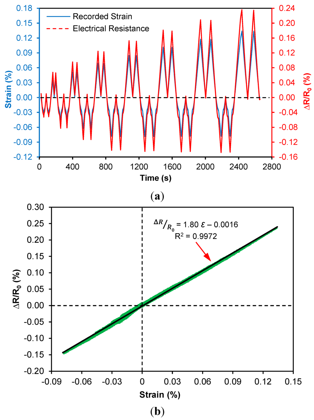 Specimen 2: For specimen Al-0.75%-CNT Figure 12a shows the tensile and compressive elastic piezoresistive response of the sensor under the prescribed loading cycle. The peak tensile strains are +0.14% and minimum compressive strains are −0.08%, which are all in the elastic range. Minimal change in recorded baseline resistance was anticipated between the transition between large and small loads. Under compression, the nanotube-nanotube tunneling gaps decrease resulting in more conductive pathways resulting in reduced electrical resistance of the CNT composite sensor. It can be seen that under the compression-tension cyclic loading protocol, the recorded electrical resistance displays very close correlations to the member strains. The sensor shows strong electrical stability as well as negligible amount of baseline resistance change among all compression-tension loading steps in real-time. From Figure 12b, it can also be seen that the piezoresistive response of the CNT composite sensor displays strong linearity for both compressive and tensile strains with a single gage factor, GF = 1.80 which is close to the gage factor (GF = 1.90) of the group of sensors with 0.75 wt % CNT loading characterized in Section 3.2, indicating a high degree of repeatability. These results are desirable and facilitate applications of this fabricated sensing layer for future SHM.