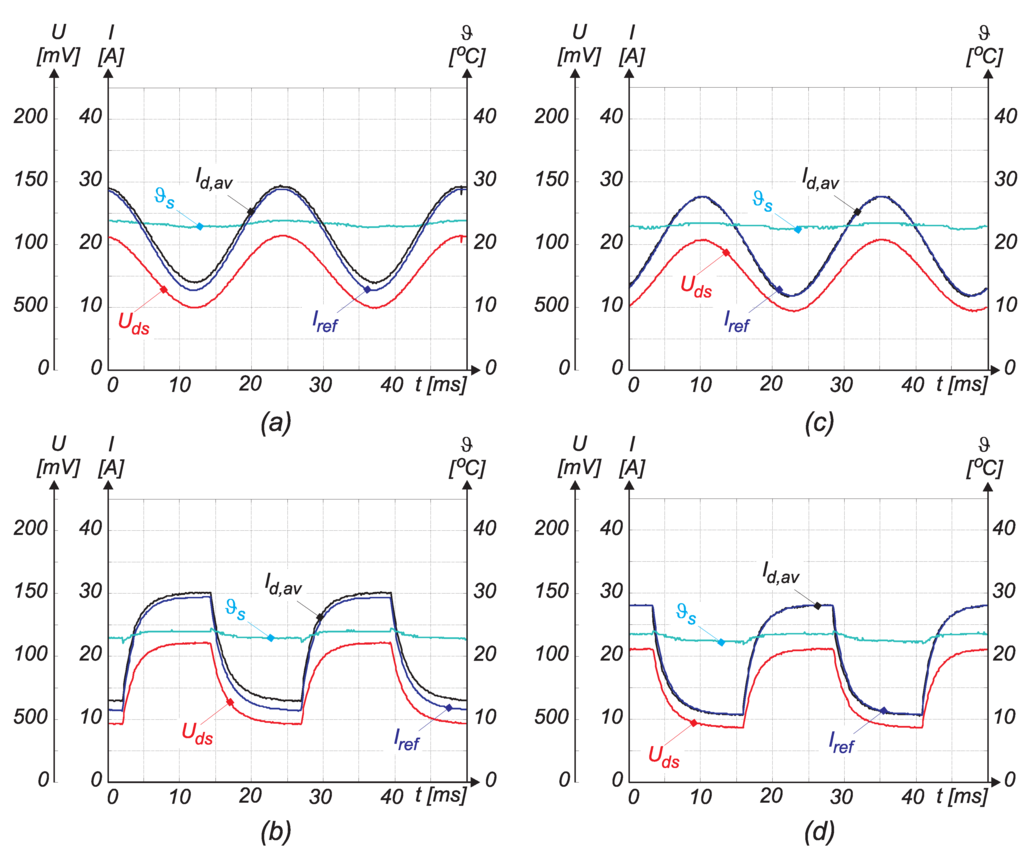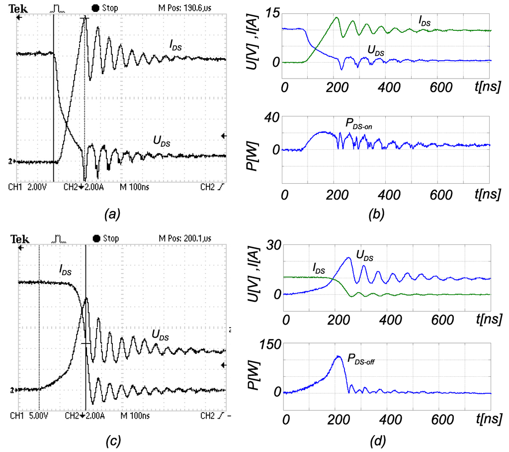 Figure 7b,d, the instantaneous losses’ waveforms’ are shown during the switching on and off. The total value of the switching losses was calculated by Equation (