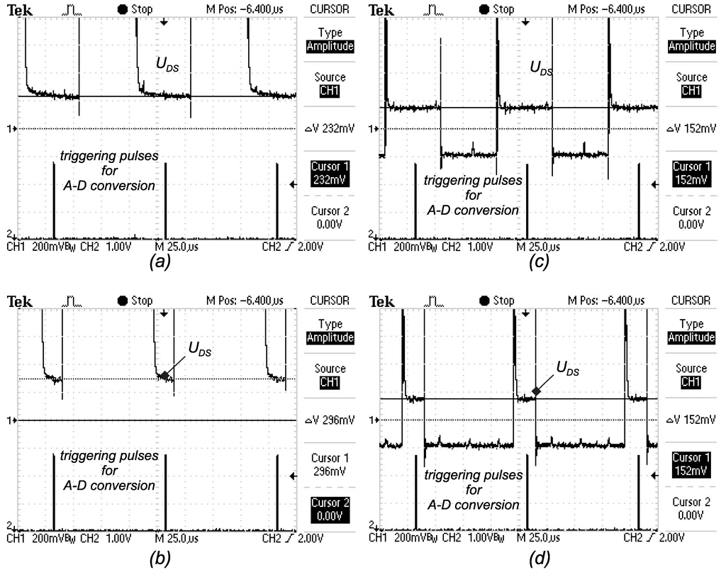 Figure 7 shows waveforms during MOS-FET turn-off at the current of 10 A and supply voltage of 10 V. The waveforms were recorded with a Tektronix oscilloscope, that has a bandwidth of 100 MHz, and the current probe was Tektronix TCP305A with amplifier TCPA300. The probe’s bandwidth is 50 MHz, and the signal propagation delay is 19 ns. The problem also occurs in the