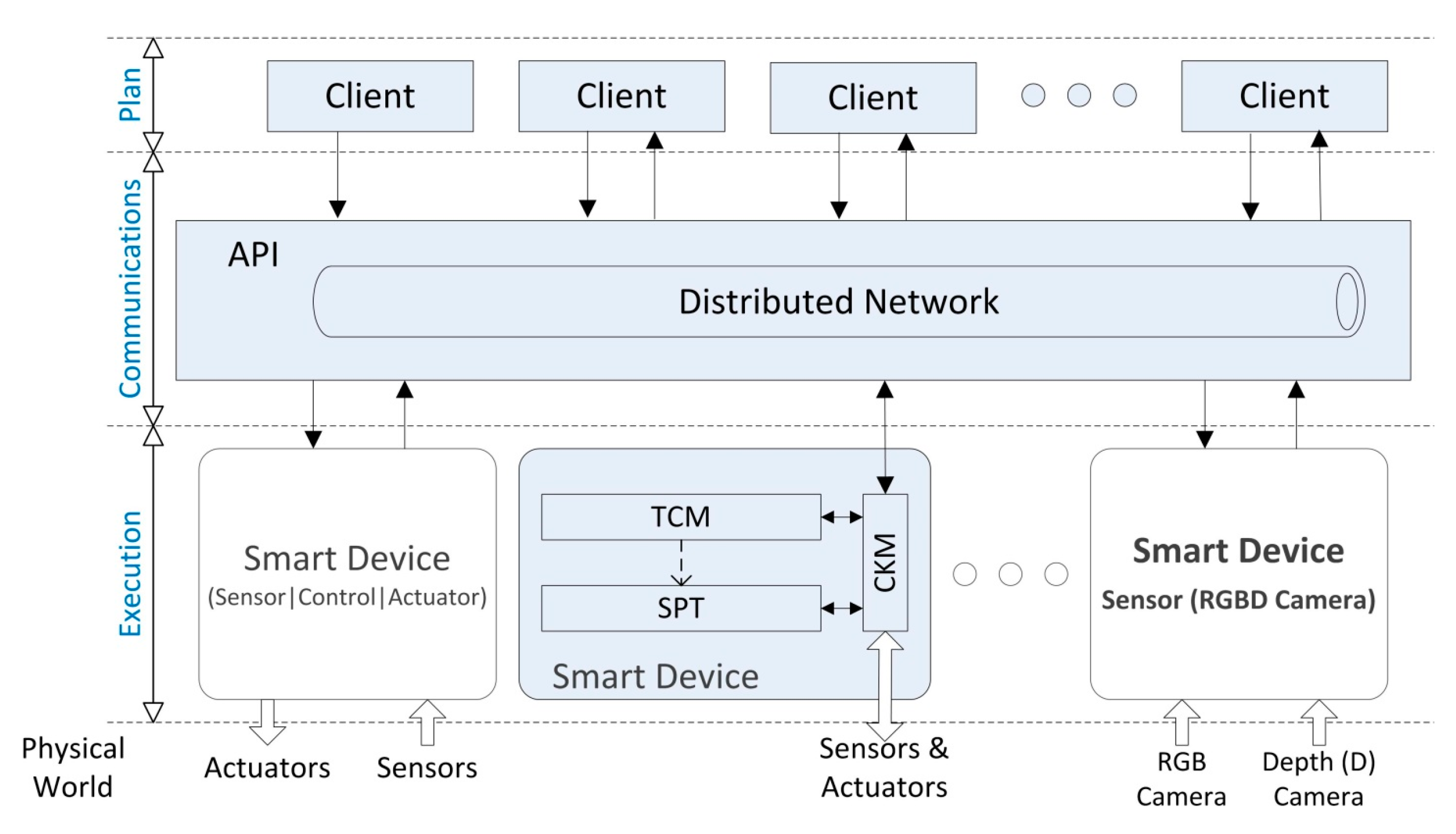 The communication layer is provided by an Application Programming Interface (API) based on a Publish/Subscribe distributed network that allows accessing to smart devices transparently. Finally, the client layer is composed by the client processes in order to perform different missions which are achieved through the execution of tasks. Some of these tasks are executed in the distributed smart devices and the communications API offers to clients the mechanisms to configure the parameters of the execution of these tasks and the mechanisms to access and monitor processed data. In this paper, a smart device based on RGBD camera is implemented to test the described DCS.