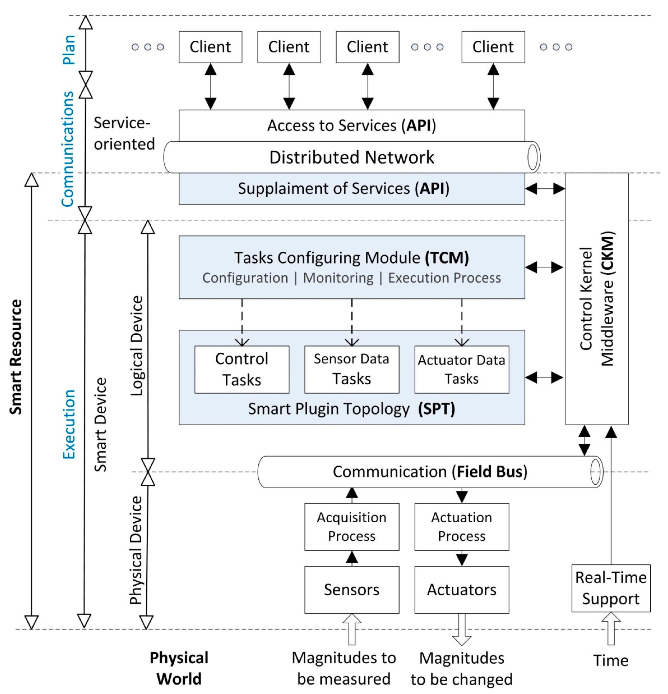 Smart devices (Figure 2) execute their tasks by using a CKM which provides real-time and data management support. The current implementation of the CKM is based in the original proposal described in [33], where is introduced the theoretical background of this control middleware. The CKM also provides field bus communications in order to manage sensors and actuators.