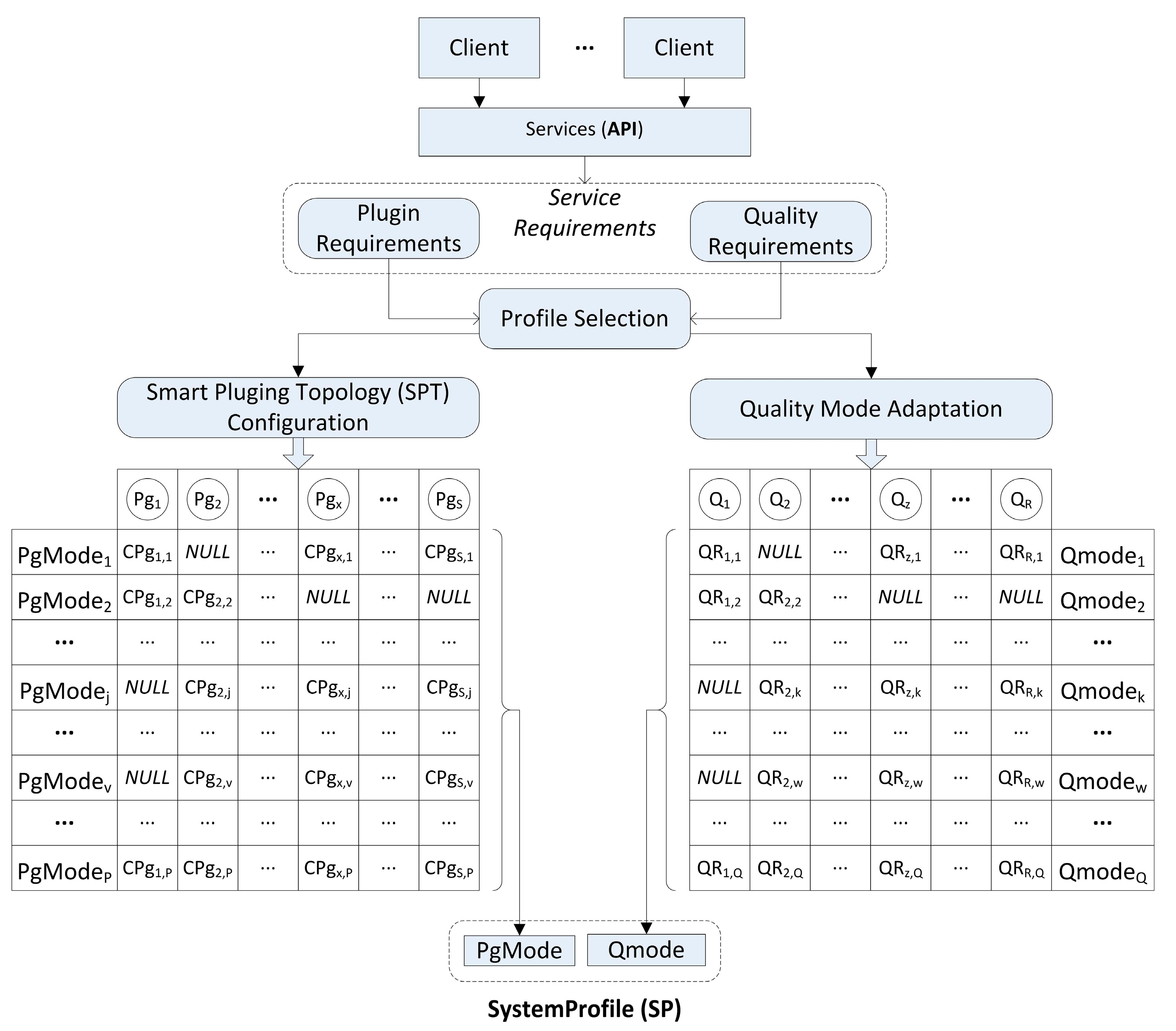 Consequently in Equation (2), a system profile SP is defined by a certain Plugin PgMode, from the given set of P plugins, and a certain quality requirement Qmode from the set Q requirements. These PgModes and Qmodes are respectively defined in the TCM: