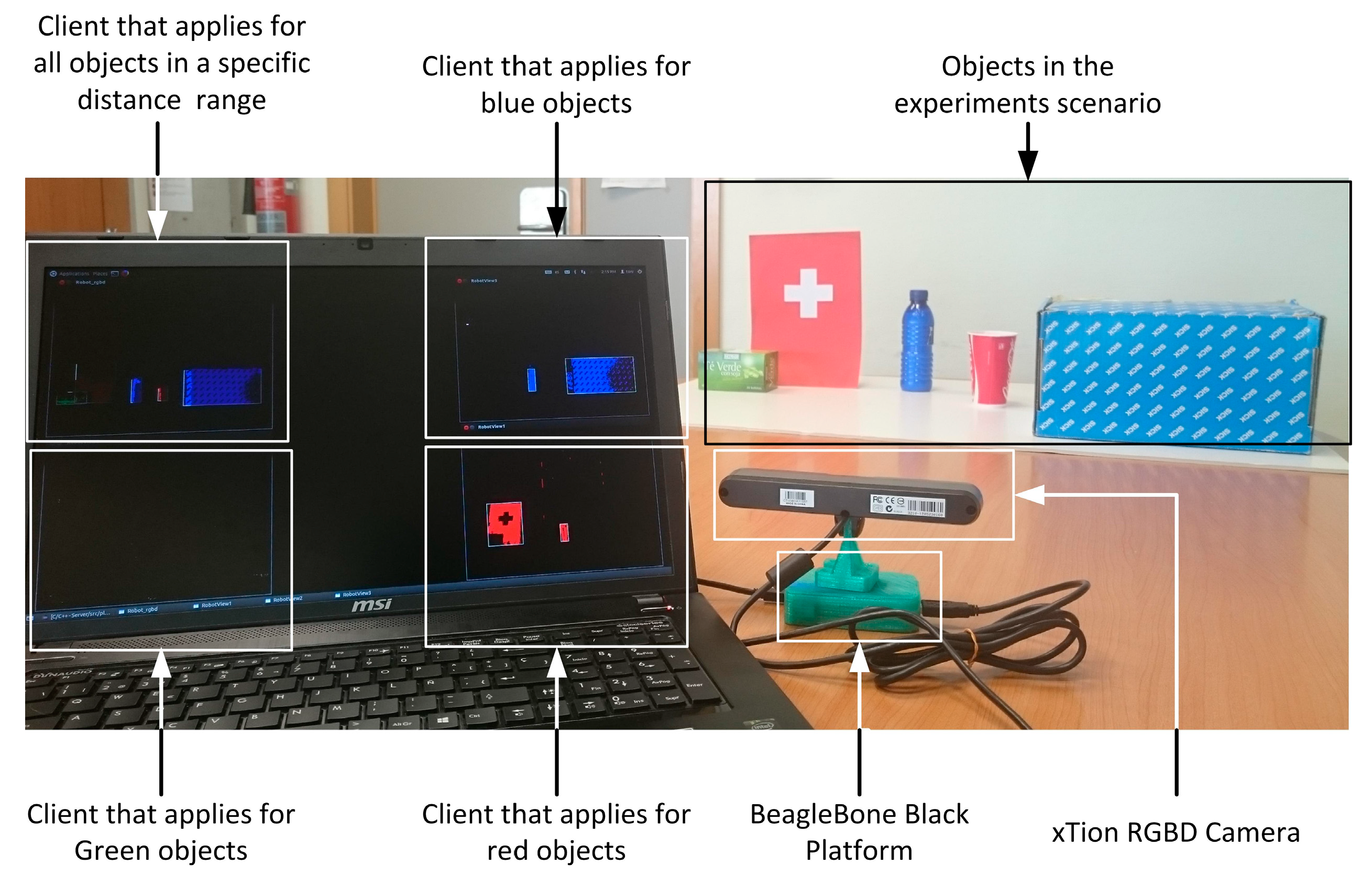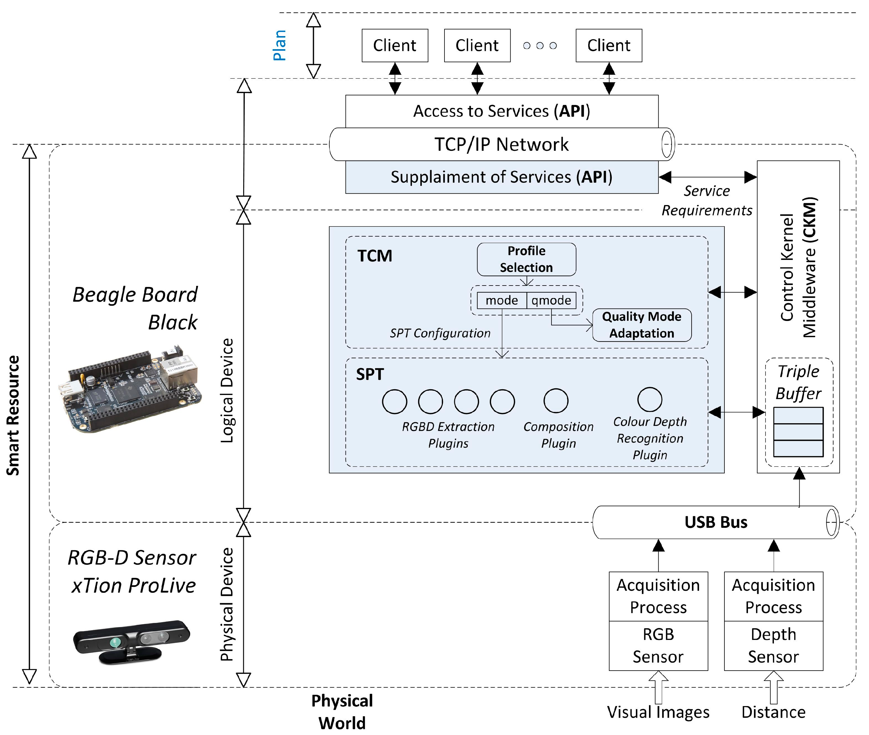 In certain applications, RGBD sensors can receive numerous petitions from different clients by requesting different type of information. For example, in robot navigation under uncertain environment conditions, where the context is changing dynamically, the information requested to detect people to avoid them or to recognize doors to generate a map could be very different in comparison. The processing load of the RGBD sensor depends on the number of client requests and their type. Anyway, the RGBD sensor should ensure some specific service requirements that depend on the internal constraints, as for example Central Processing Unit (CPU) load. These service requirements can be specified with the quality of context (QoC) [12] and quality of service (QoS) [13] parameters. A client requests a specific QoS, for example the minimal resolution for the images, and the RGBD sensor provides this QoS according to its QoC, for example, by adjusting the image resolution in order to not to exceed a specific CPU load. Therefore, the smart resource should have an internal mechanism that allows adapt the processing to the constraints according to QoS and QoC.