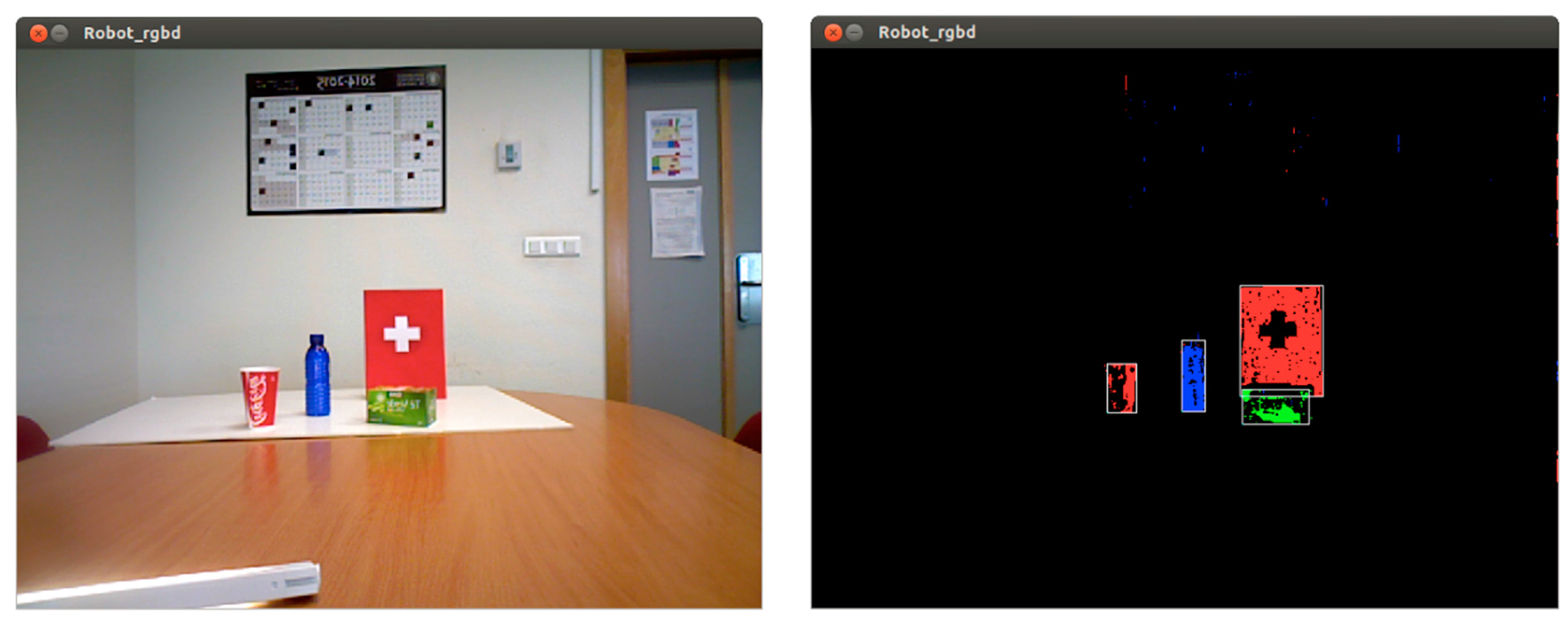 The raw data process is based in the work presented in [35] and occurs in three different parts: segmentation, blob detection and feature recognition. First of all the segmentation process allows one to extract same colour and depth regions from the raw image. Next some of these regions are grouped forming image blobs by using the seed region growing (SRG) technique [36]. Finally some shape, size, density and colour characteristics will be analyzed in order to recognize some environment features.
