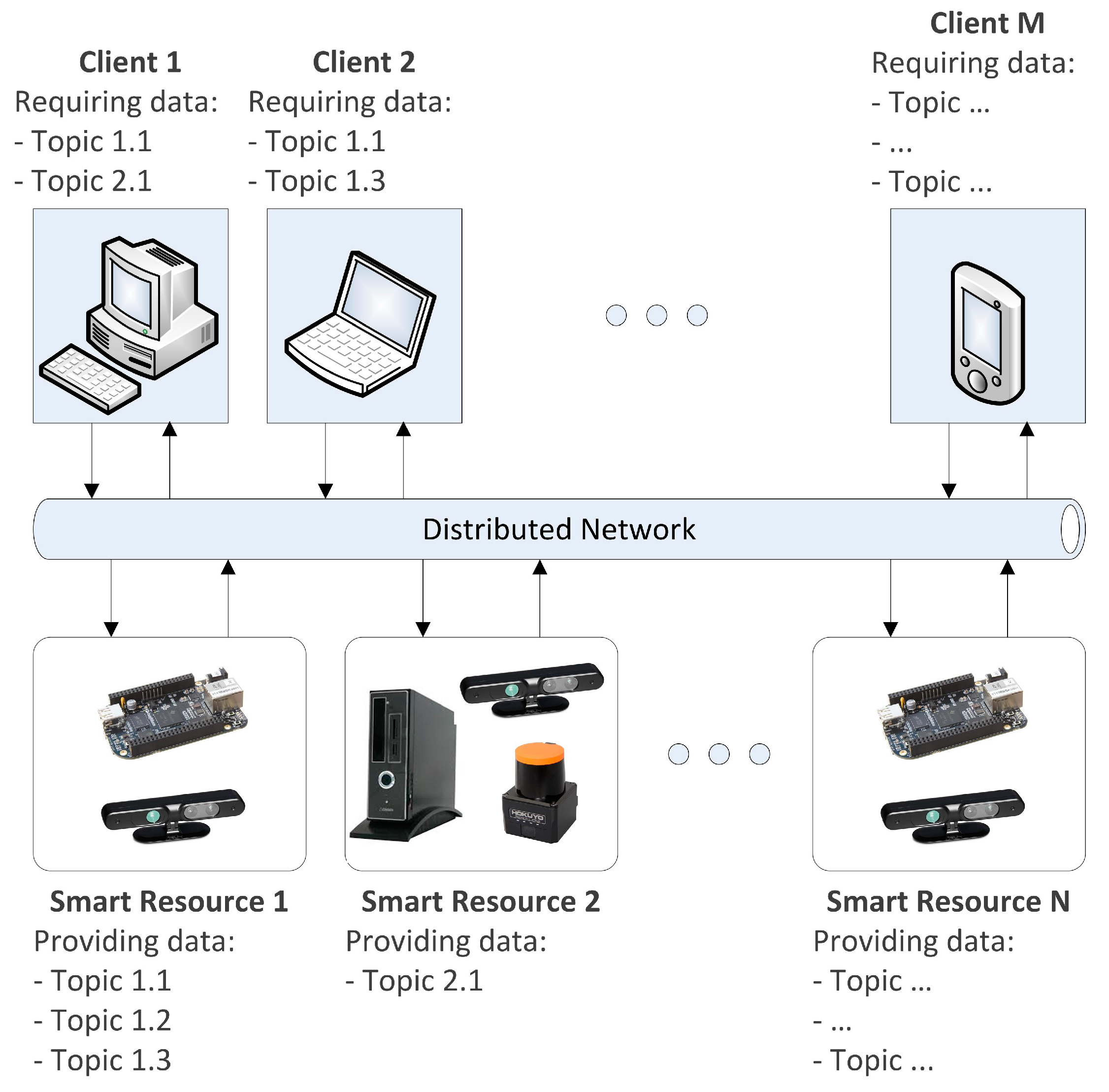 In the introduction of our framework, the communication has been characterized as a publish/subscribe paradigm. As any implementation of this topology, information is organized by topics. That way each process in the network can publish information in a certain topic in order to send the information between all the processes subscribed to that one. In this way, each device is only aware of the information which concerns its performance. Smart devices are designed to deal with two main types of topics: