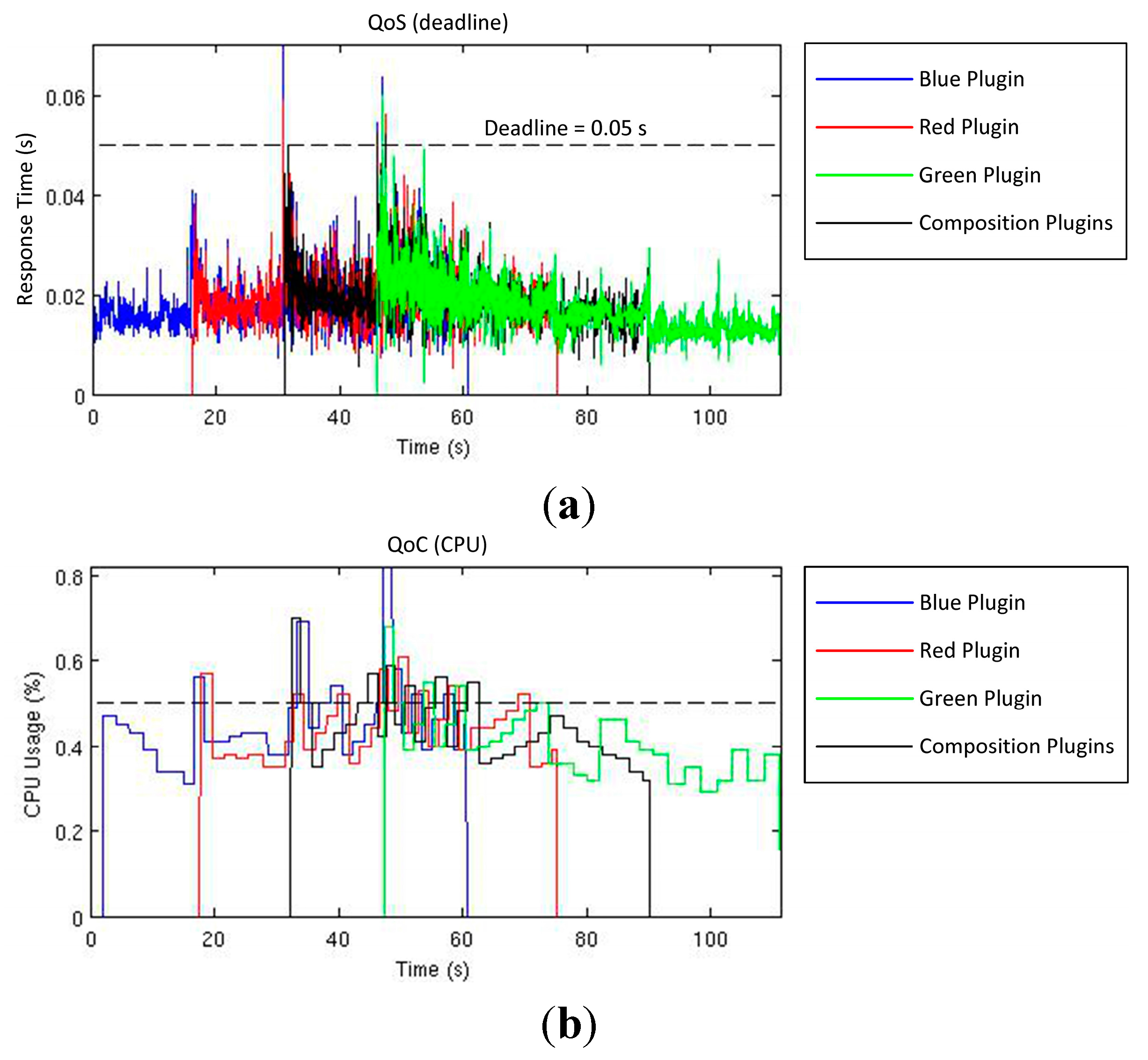 The results of this test, depicted in Figure 10, Figure 11 and Figure 12, are numerically analyzed in Table 4 where a quantitative analysis of the evolution of the system variables according to the number of active clients, which reflects in fact the number of active plugins, is gathered. As the numbers of clients are augmented, the activation time of higher resolutions decreases whereas the deadline, CPU and memory measures are augmented. Once the system resources are employed to the edge of its capabilities, the number of alarms produced by the system is increased. As the number of alarms increases, the global penalization of the system augments. A significant increment on the alarms, and consequently the penalization, can be interpreted as an approach to the maximum system resource usage according to the specified quality bounds.