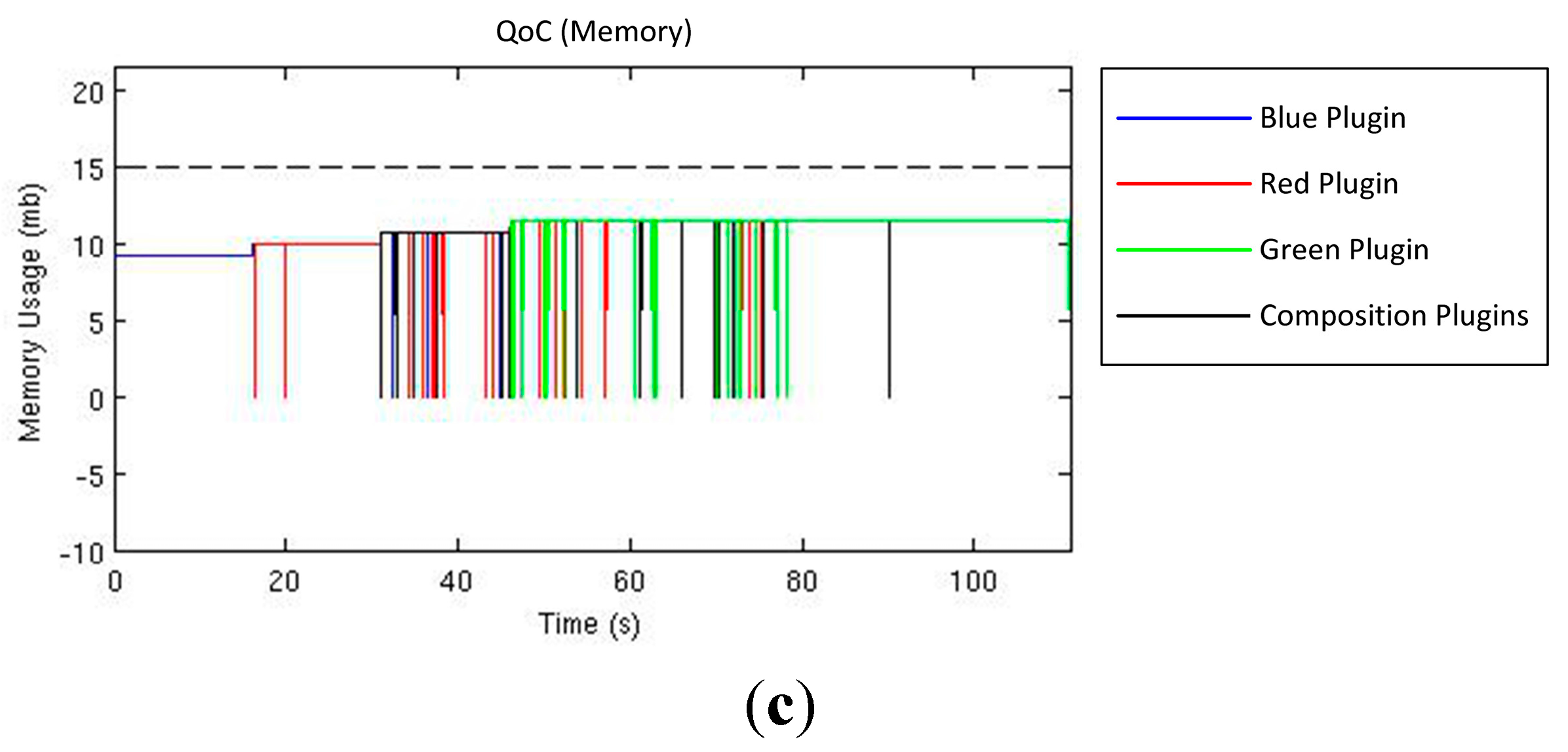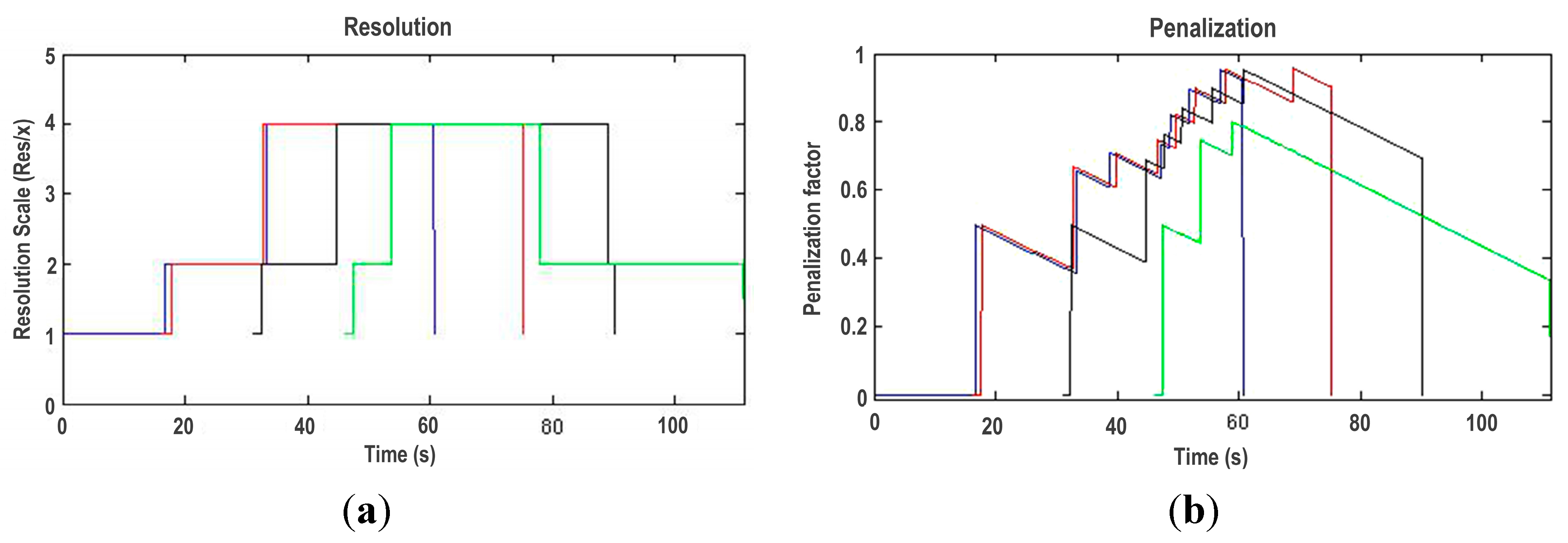 The changes between image resolutions according to the requirements of the system are detailed in Figure 12a. As can be shown, a certain number of plugins leads to a stable configuration of plugins, but at the same time the TCM is always evaluating the resources in order to increase again the resolution. This resource evaluation is conditioned by the evolution of the penalization factor as depicted in the respective graph (Figure 12b). In Section 4.3 the function of this penalization value has been theoretically introduced, which in this test proves to suit the dynamics of the system, leading to a resolution change only when the context meets the requirements.
