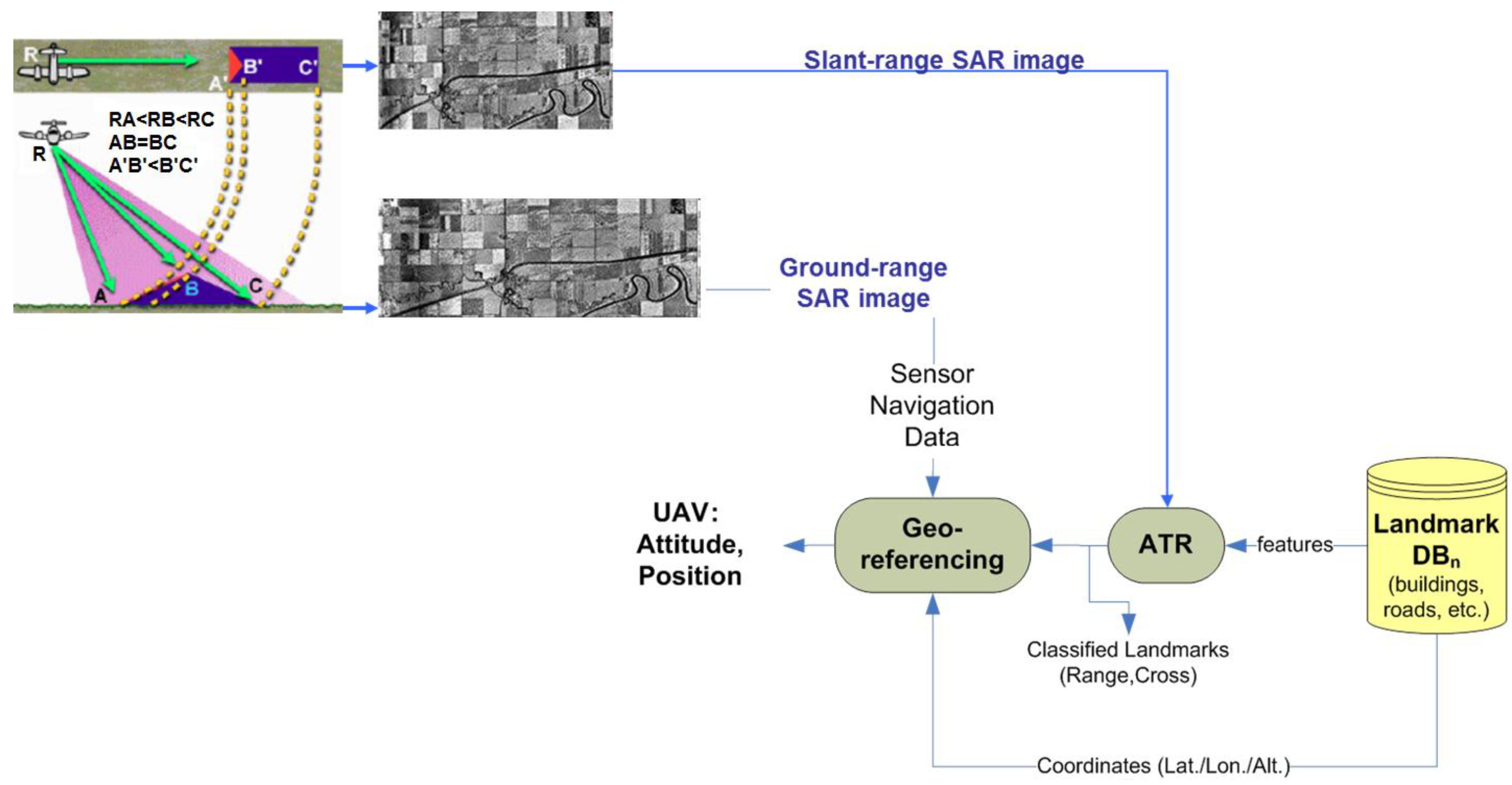 Figure 1. It can be noted that viewing geometry and SAR geometrical distortions have to be considered in order to derive a meaningful geo-referencing algorithm based on the recognition of landmarks in SAR images. A basic viewing geometry of an SAR is shown in