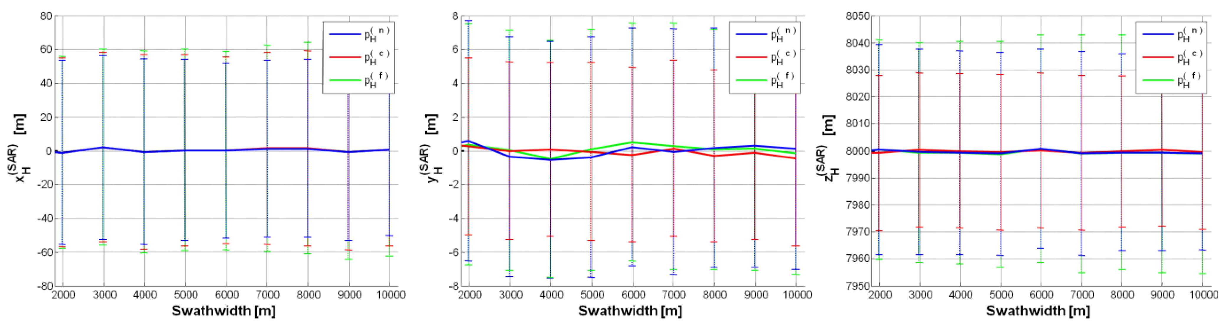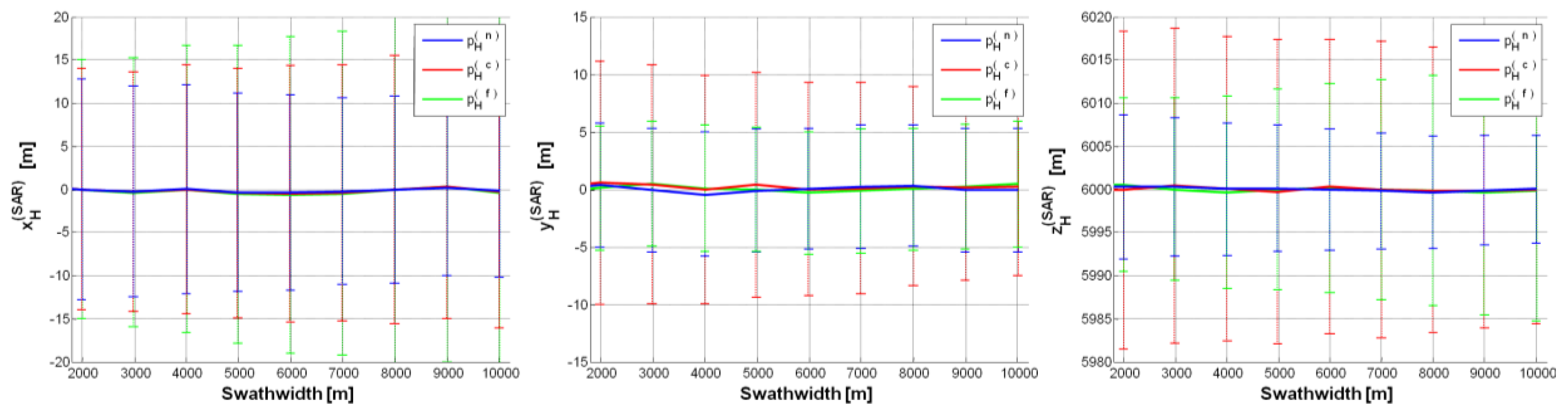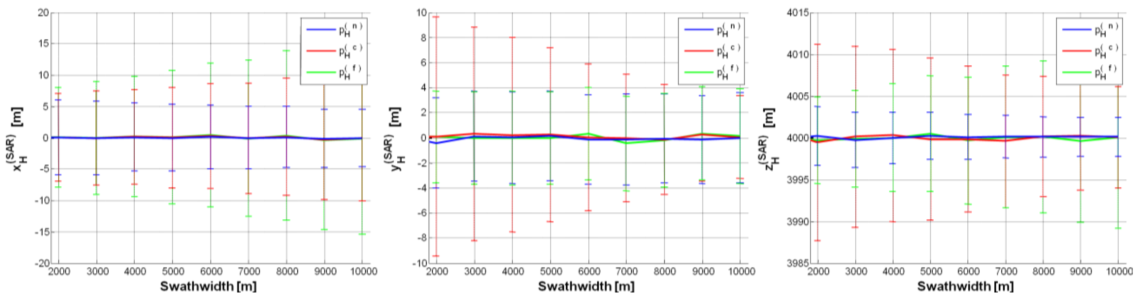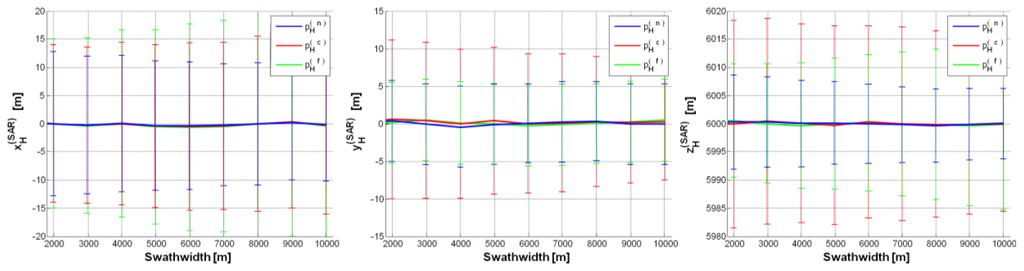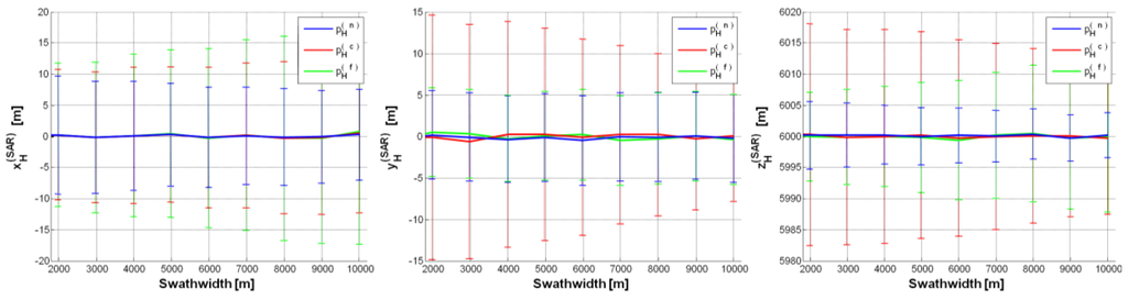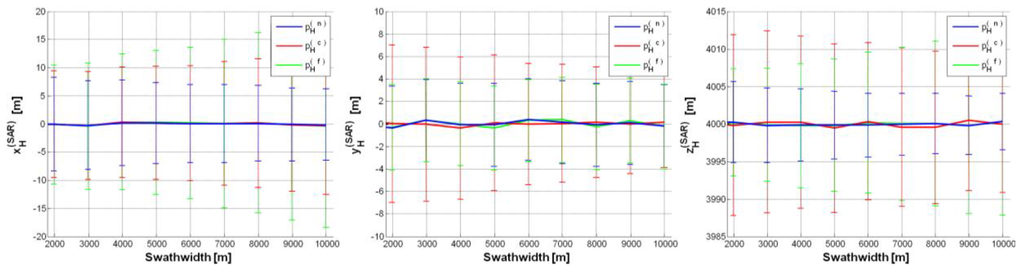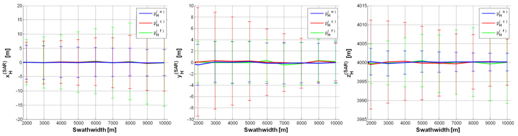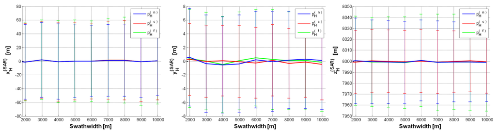 p = ±2. Error (on each SAR position component) mean value curve as a function of swath-width (