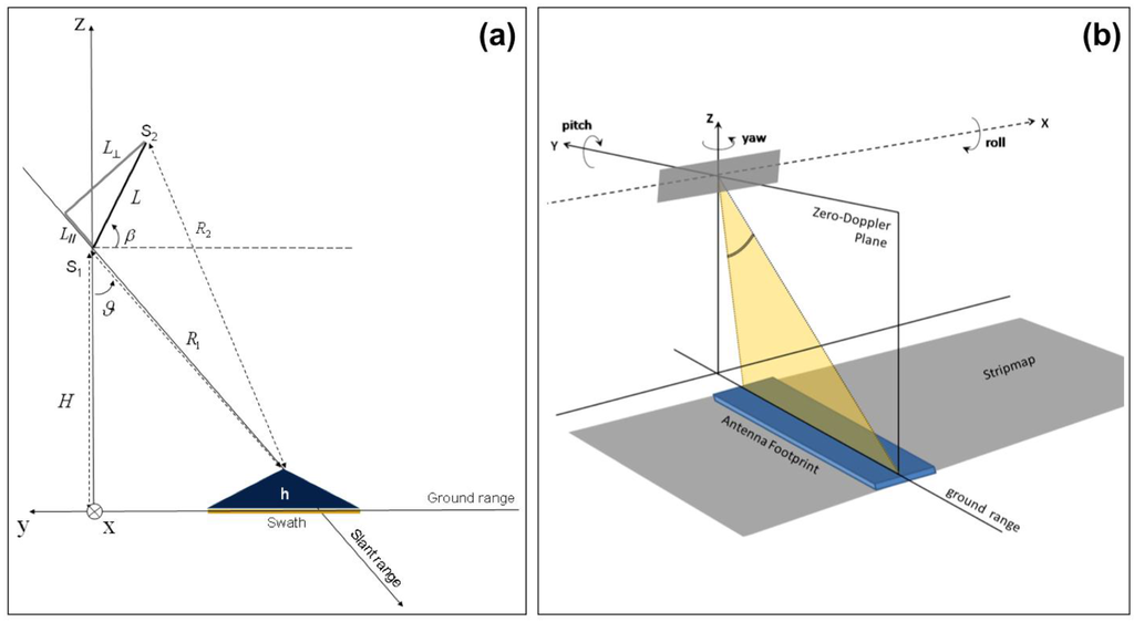 It is worth noting that this section does not aim to provide an SAR-amplitude based geo-referencing procedure, but only a simplified mathematical approach to perform a feasibility analysis.