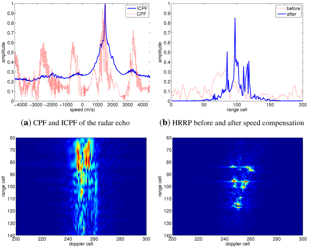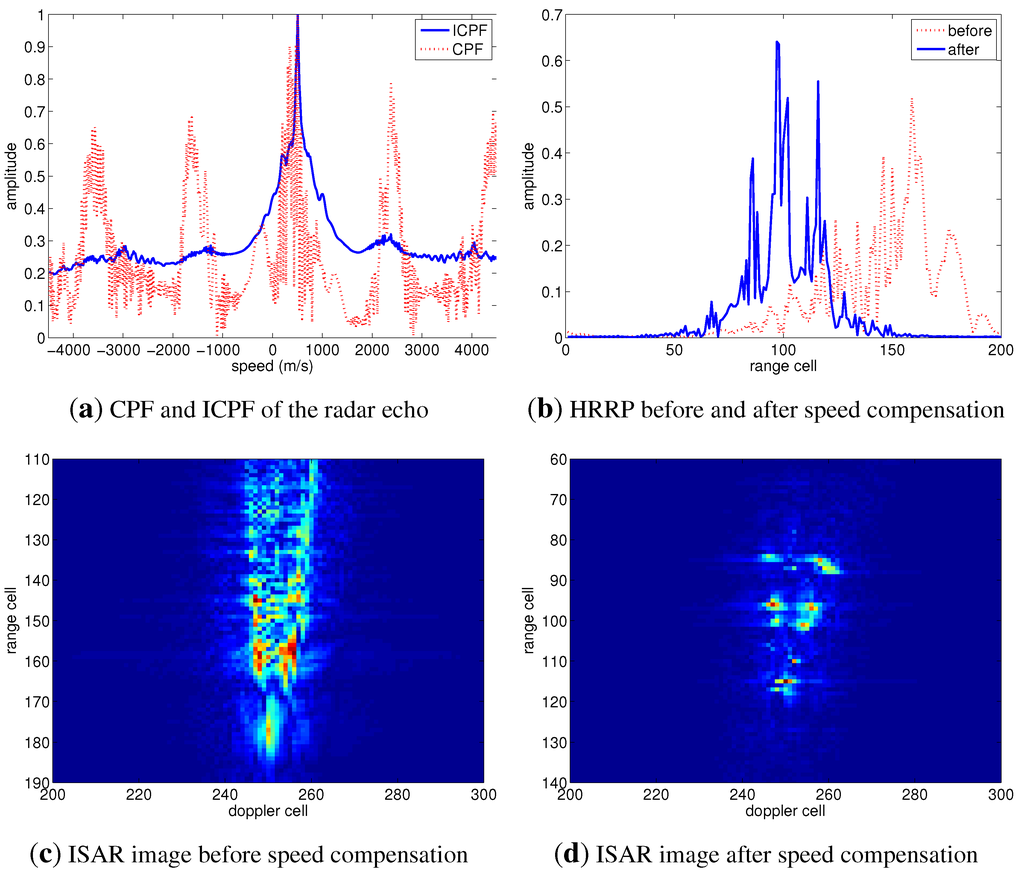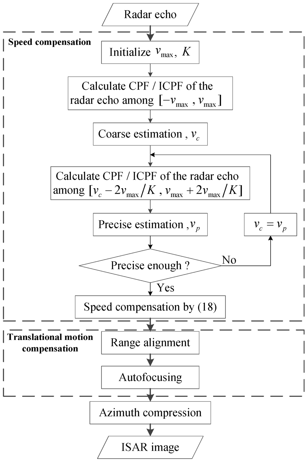 As far as the radar system for speed compensation is concerned, the ISAR system usually is accompanied by the narrowband mode, which conducts the functions of searching and tracking the target. This radar system mode rarely provides high enough precision for the target speed for ISAR imaging, while inducing implementation difficulties in the radar system. An alternative solution is to estimate speed directly from the wideband radar echo by signal processing, which has the advantage of decreasing the burden of the radar system, and this work has attracted much attention in theradar community.