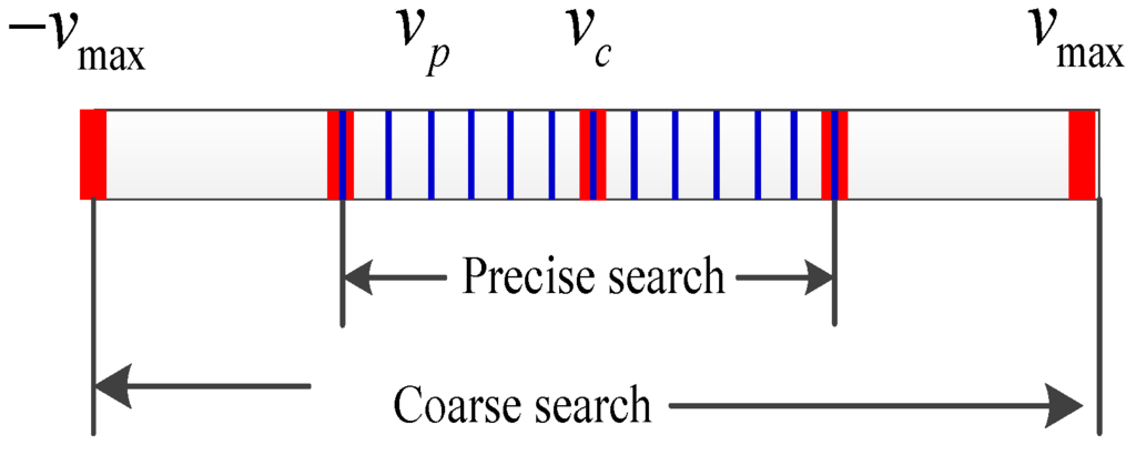 - Search CPF or ICPF to obtain the coarse estimation of speed by Equation (17) or Equation (22). The precision of the coarse estimation of speed is .