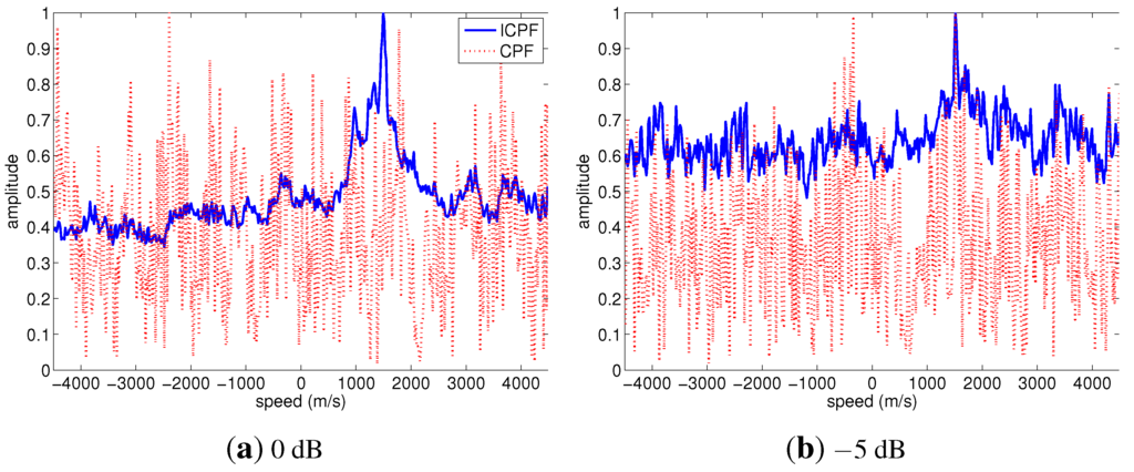 The performances of the speed estimation methods based on CPF and ICPF under low SNR conditions are considered. Figure 6 shows the CPF and ICPF of the radar echo under the conditions of SNR = 0 dB and SNR = 5 dB, respectively. It has been shown that the CPF curve is embedded in strong noise and does not exhibit a peak at a speed of 1500 m/s when SNR = 0 dB; while the ICPF is robust to noise, it still contains an obvious peak at 1500 m/s when the SNR is as low as −5 dB. Hence, the speed compensation method based on ICPF is more robust than that based on CPF.