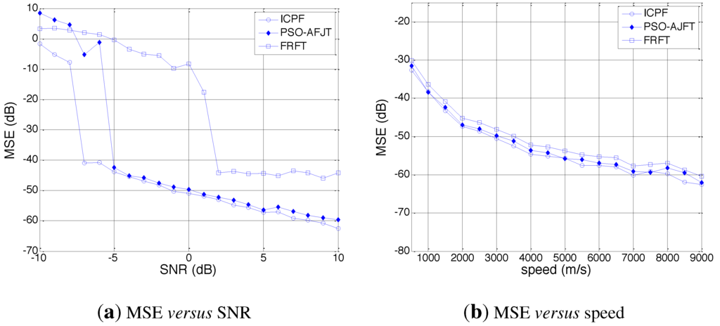 The performance of the proposed method is further compared to that of PSO-AJFT and FRFT.Figure 7 shows the Monte-Carlo simulation results for the speed estimation methods based on ICPF, PSO-AJFT and FRFT, where the number of Monte-Carlo simulations is set as 100. The mean squared error (MSE) for three methods in different SNR conditions is shown as Figure 7a, where MSE is defined as follows:
