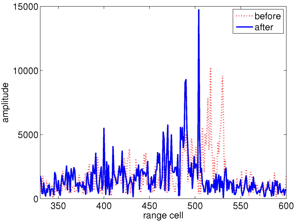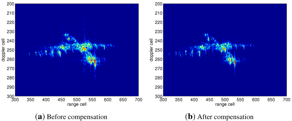Radar data of an aircraft are utilized to further validate the effectiveness of the proposed methods. The waveform parameters are as follows: the center frequency is 9 GHz; the band width is 1 GHz; and the PRF is 250 Hz. Figure 8 shows the comparison between the HRRP before and after the speed compensation, where the dashed and real curves represent the HRRP before and after speed compensation, respectively. It has been shown that the HRRP after speed compensation is better focused than that before compensation. The ISAR images before and after speed compensation are shown as Figure 9. It can be seen from Figure 9a that the scatterers on the wing and tail of the aircraft are better focused than those shown in Figure 9b, which verifies the effectiveness of the proposed method.