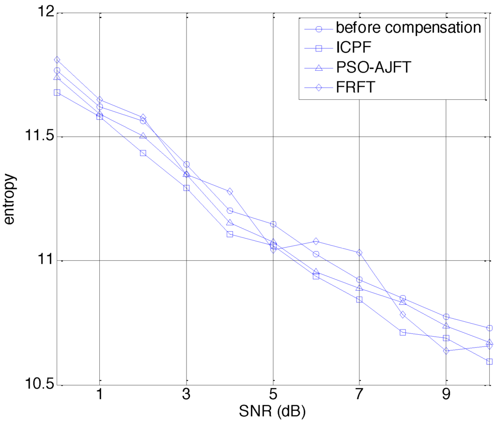 Moreover, the image entropy [] has been introduced to numerically compare the performance of ICPF with that of PSO-AJFT and FRFT. The smaller the image entropy is, the better the speed compensation method performs. Figure 10 shows the image entropy achieved by the three methods in different SNR conditions. It can be seen that the entropy obtained by ICPF is smaller than that achieved by PSO-AJFT and FRFT. Hence, ICPF compensates the speed more precisely than the other two methods.