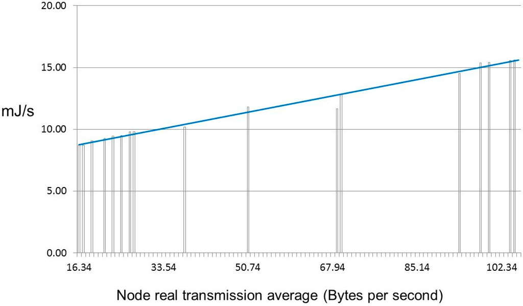 Power consumption is another relevant parameter useful to characterize the proposed system. Measurements were made taking into account the communication effort, which is always an unquestionable variable in the final power consumption of sensor networks. This type of analysis is thus necessary for cluster size decisions. Although the power supply of the sensor nodes can be obtained from the PV-modules, these nodes also include an additional energy harvesting module that is independent of PV-module performance. Figure 11 shows the energy consumption in mJ per second obtained in scenario 3 (630 Bps). The Pearson product-moment correlation coefficient of this sample ρX,Y was 0.986. A value close to 1 implies a linear equation describing the relationship between the average of frames transmitted per second including re-transmitted frames and power demanded per second. Moreover, a sink node with 314 Bps in our sample consumed 34.63 mJ per second.