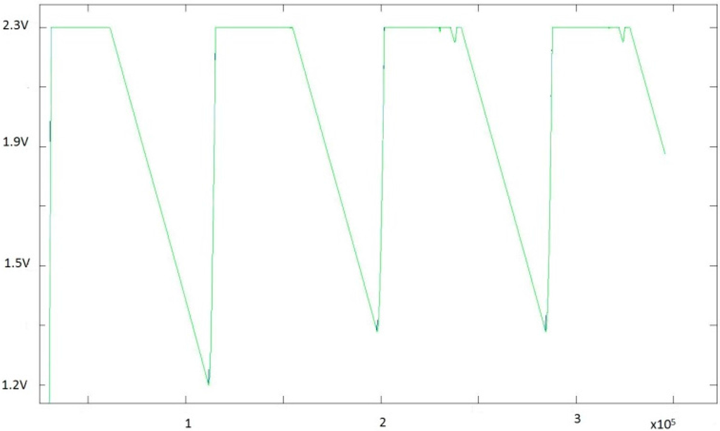 Capacitor charge and discharge periods were observed in a node with the following parameters: 36.2 mA in transmission, 19.7 mA in reception, 5 mA in active, and additional sensor power consumption in active of 6 mA. Transmission time per frame was set to 570 µs and maximum reception time 100 ms with the number of frames per package (k) = 15. Additionally, the node active time was 40 ms before transmission, and sleep time after reception was 60 s. Figure 12 shows a three-day test. During daylight, the super-capacitor charge remained within acceptable values. However, at night there was no recharge period, and the super-capacitor charge could only decrement cycle by cycle. Strategies to reduce power consumption at night were based on Energy Neutral Operation (ENO), where sleep time was adjusted as a function of the available energy that could be applied and recommended for PV monitoring [50].