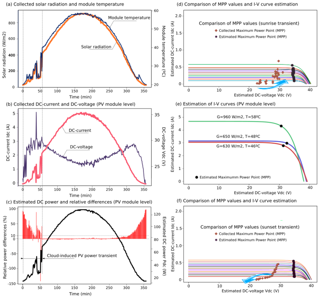 To illustrate the proposed solution, various G&T profiles were selected, including oscillations during cloudy days that involved major differences between estimated and collected data, see Figure 13 and Figure 14. According to [53], PV power generation is volatile because cloud-cover produces erratic variations in solar irradiance and PV power production, also affected by the inverter performance and the MPP Tracking algorithm. A comparison between estimated I-V curves with their corresponding MMP values and collected MPP data are also included for sustained transients as well, such as at sunrise and sunset. Indeed, these transients were observed at 10–21 percent of output over 15 min in previous studies [54]. Nevertheless, all estimated values were obtained with minimal hardware requirements and low computational time costs, avoiding convergence problems and iterative processes. Averaged differences between estimated and collected PV power are below 10%. These differences are higher under the presence of significant solar radiation oscillations and at low levels of irradiance (sunrise and sunset), when it is difficult for the inverters to find the optimal value for the maximum power point [16].