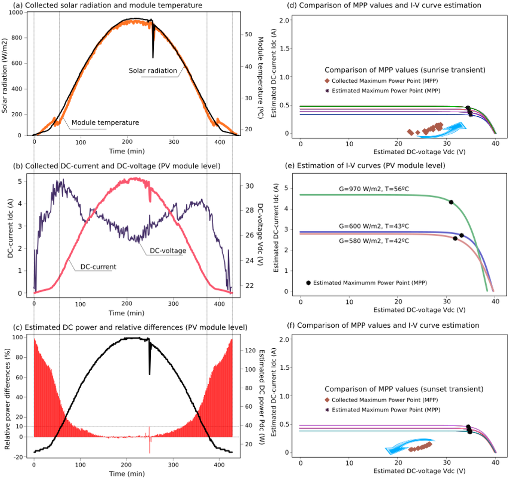 Case Study II: collected data (a,b); estimations of DC power (c), and I-V curves at the PV module level (d–f).