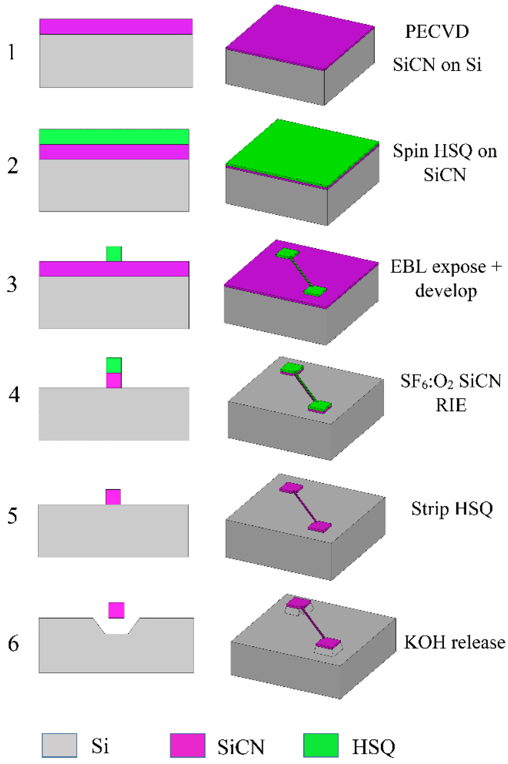 Figure 1 shows the process flow employed to fabricate the SiCN nanostrings. A single crystal (100) silicon wafer (500 µm thick, 100 mm diameter) was first treated with piranha cleaning solution (3:1 H2SO4: H2O2) for 15 min and buffered oxide etch (BOE, 10:1 HF: NH4F) for 3 min. A 50 nm thick SiCN layer was deposited by using plasma enhanced chemical vapor deposition (PECVD) at a gas ratio of 4:1 NH3: diethylsilane (DES) at a deposition temperature of 300 °C and a pressure of 500 mTorr. The thickness of the SiCN film was measured using a Filmetrics F50 thickness mapping system (Filmetrics, San Diego, CA, USA). The deposited SiCN film was characterized by a Flexus 2320 wafer stress measurement system (KLA Tencor, Milpitas, CA, USA) and exhibited a compressive stress of −764 MPa. The wafer was then annealed in a MiniBrute 3 zone tube furnace (Thermco, Lafayette, NJ, USA) at 525 °C for 2 h after which the SiCN film exhibited a tensile stress of +169 MPa. The wafer was diced into 0.7 cm × 0.7 cm square samples and piranha-cleaned again before EBL resist coating. A prior study of these films [51] showed they possess a density ρ = 2200 kg/m3. Such value will thus be used in subsequent analysis.