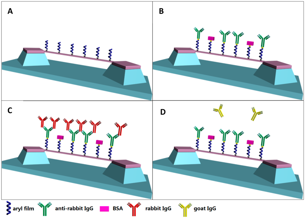 Surface modification and immobilization of molecular probe and target onto SiCN nanostrings. (A) SiCN resonators were modified by aryl diazonium salt; (B) The probe anti-rabbit IgG antibody was immobilized onto the diazonium layer; (C) The target rabbit IgG binds to the probe rabbit IgG antibody; (D) The control goat IgG does not bind to the probe rabbit IgG antibody.