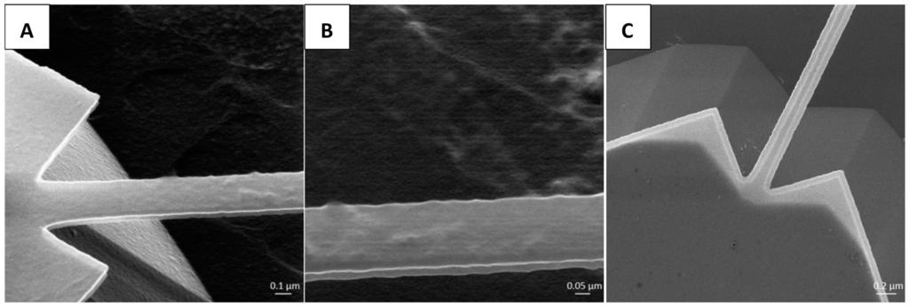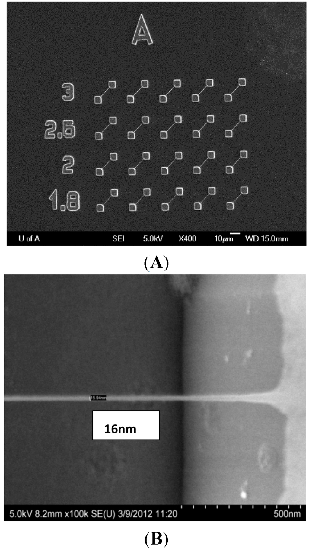 A high magnification view of a 16 nm wide string is shown in Figure 3B. The fabrication yield approached 100%. The SiCN release process by KOH bulk etching silicon was stiction-free due to the high gap between the SiCN string and the silicon substrate. Hence, a critical point drying (CPD) step usually required in most MEMS/NEMS device fabrication was not needed in this process.