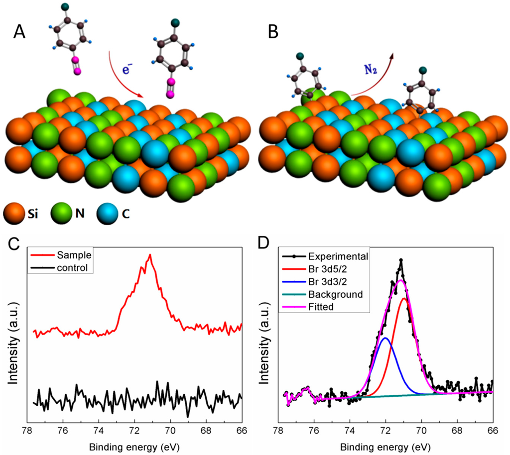 Reaction mechanism and XPS analysis of aryl diazonium modification of SiCN surface: (A) Aryl diazonium salt reduction by electrons; (B) the created free aryl radicals strongly bond to the SiCN surface; (C) XPS high resolution scans of Br element spectra on aryl diazonium modified SiCN sample and control surfaces; (D) XPS experimental bromine spectrum and theoretical Br 3d fitted curves.
