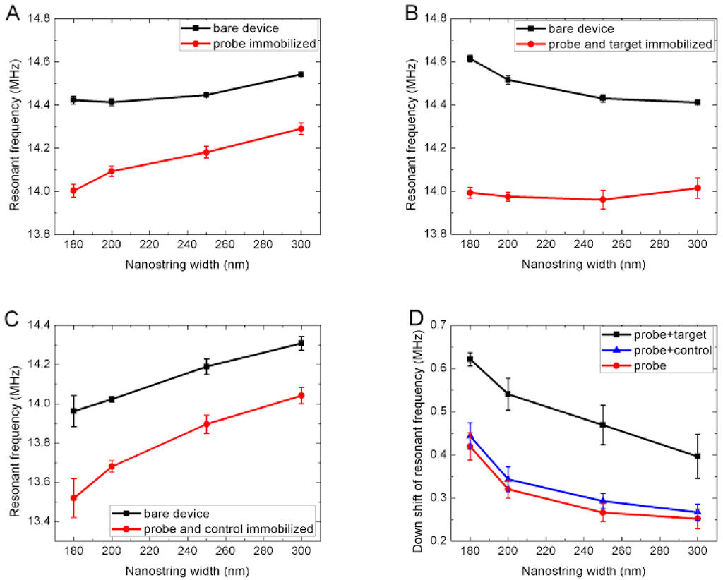 Resonant frequency change of nanostring resonators in samples A, B and C due to surface functionalization. Each of the chips has an array of 20 devices. The resonant frequency is obtained based on statistical analysis of five devices of the same string width. (A) Chip A: bare device versus the attachment of aryl film, anti-rabbit IgG and BSA. The black squares and red circles respectively designate the bare resonators and resonators immobilized with probe i.e., anti-rabbit IgG and BSA; (B) Chip B: bare device versus the attachment of aryl film, anti-rabbit IgG, BSA and rabbit IgG. The black squares and red circles respectively designate the bare resonators and resonators immobilized with probe i.e., anti-rabbit IgG and BSA and target rabbit IgG; (C) Chip C: bare device versus the attachment of aryl film, anti-rabbit IgG, BSA and goat IgG. The black squares and red circles respectively designate the bare resonators and resonators immobilized with probe i.e., anti-rabbit IgG, BSA and control goat IgG; (D) Comparison of down shifts of resonant frequencies due to the surface adsorption of probe, probe and target, and probe and control. The red circles designate the resonators of chip A immobilized with probe i.e., anti-rabbit IgG, BSA. The black squares correspond to the resonators of sample B immobilized with probe and target rabbit IgG. The blue triangles designate the resonators of sample C immobilized with probe and control goat IgG.
