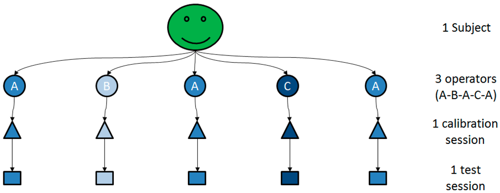 At the beginning of the experiment, the subject was equipped with the reflective markers; they were not removed or replaced throughout the experiment. Then, he had to perform five experimental sessions, each composed of a calibration session and a test session. The five calibration sessions were supervised by three different operators (A,B,C) in the following fixed order A-B-A-C-A (Figure 1).
