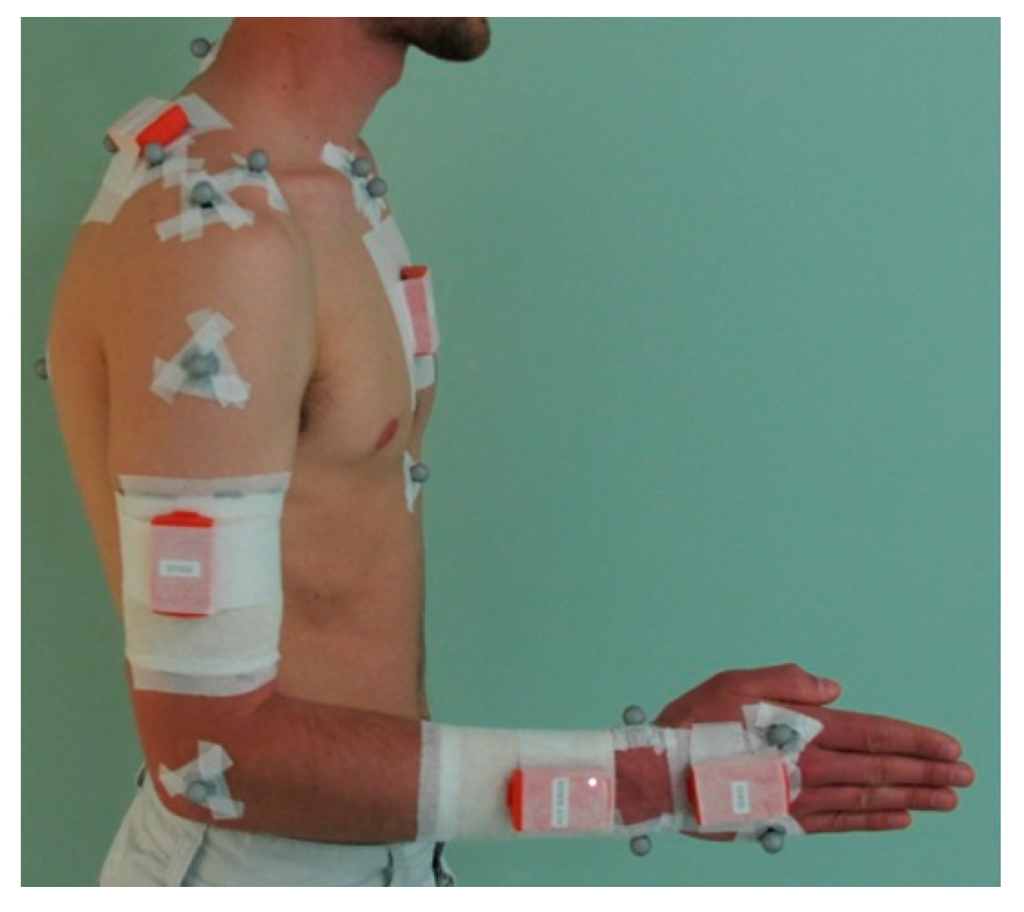 Quantitative evaluation of upper limb kinematics is required in various applications such as rehabilitation, medicine, sport, and ergonomics. For such evaluations, several technological solutions associated with dedicated protocols of use are now proposed in the literature [1,2]. The optoelectronic system certainly represents the most widespread and mature non-invasive technology currently available, with many protocols having been proposed in the last two decades [3,4], including international standards (International Society of Biomechanics, ISB) [5]. Usually, this technology is based on infra-red cameras that track the 3D position of reflective markers placed on the subject. Although the high measurement accuracy of this technology is not challenged (0.1 mm in position, [6]), some limitations of use are involved such as lengthy camera calibration time, the restricted area of measurement (i.e., within a calibrated space), and marker occlusions, often restricting its use to controlled laboratory environments [7].