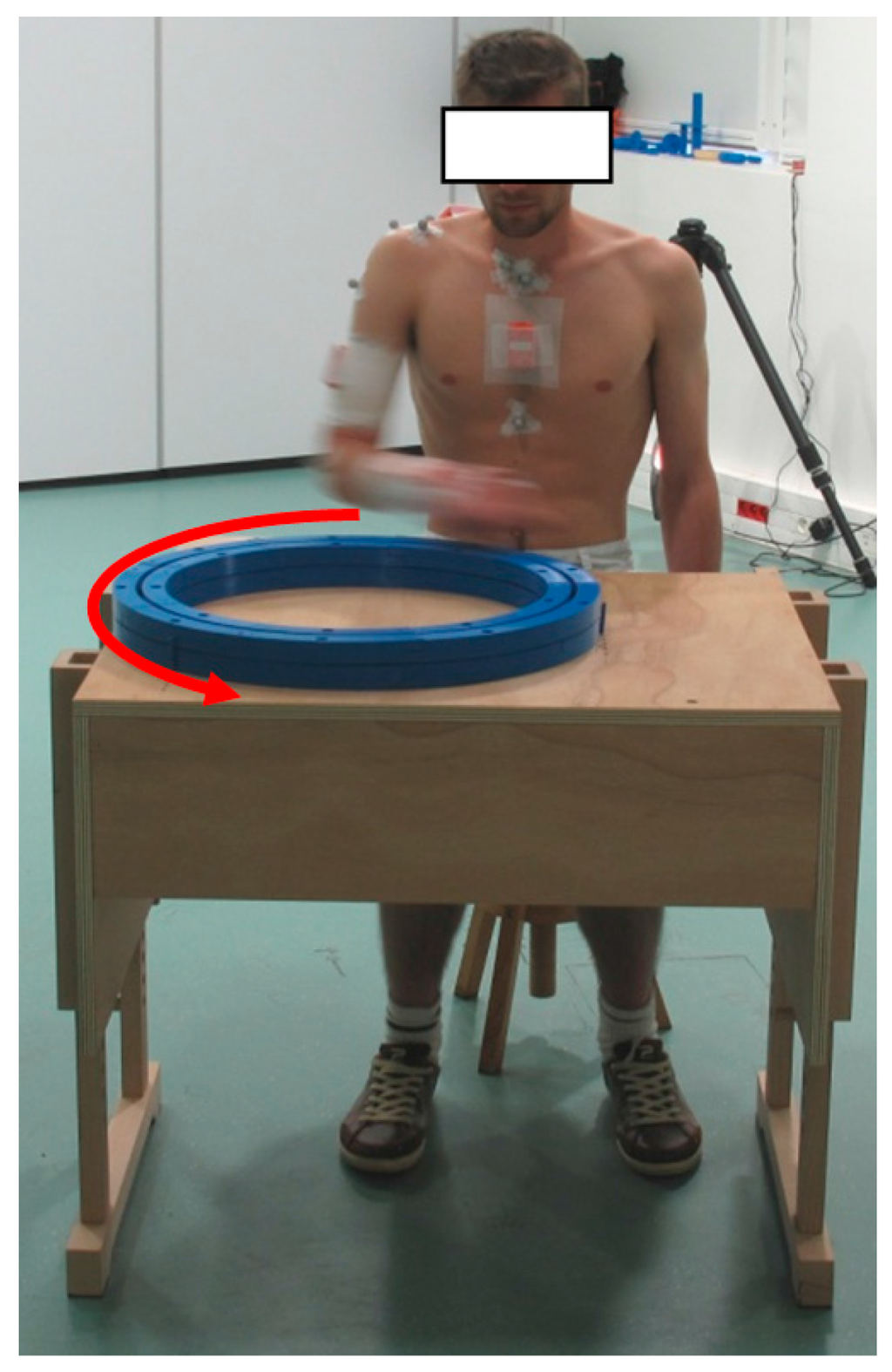 All the test movements were performed with the right limb only. Test movements of maximal amplitude corresponded to a series of 16 (launched) consecutive rotations, performed freely in the air at moderate speed. Regarding the shoulder abduction movement, the scapular plane was defined as 30° anterior to the frontal plane [30,31]. A dedicated piece of wood forming a 30° angle was used to indicate the plane of elevation expected to the subject just before he started the movement.