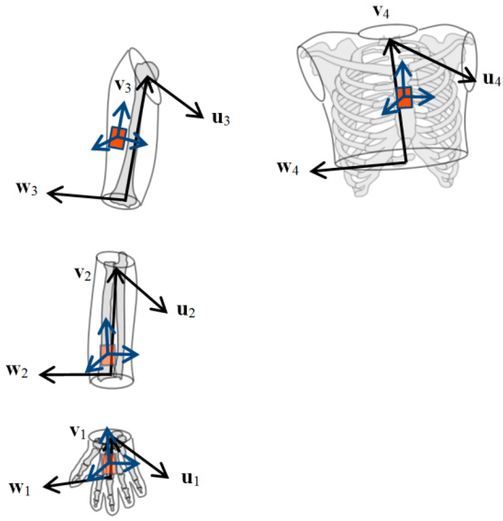 The non-orthonormal segment representation (u,v,w) used for the hand, forearm, upper arm, and thorax segments.