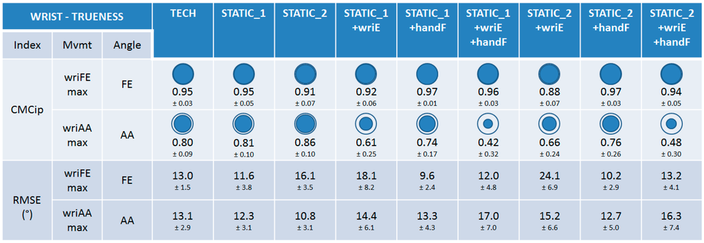 The results on trueness for the wrist joint. CMCip and RMSE values are reported for the different calibrations during maximal wrist flexion-extension (wriFEmax) and abduction-adduction (wriAAmax). For visual clarity, the CMCip mean value is completed with a proportional blue disc included in a blue circle that represents the optimal value 1.