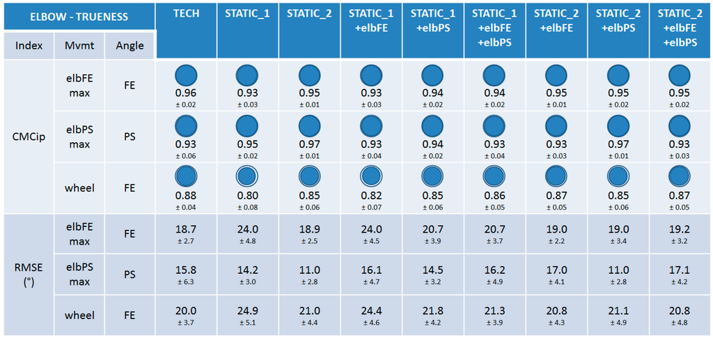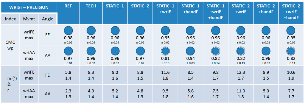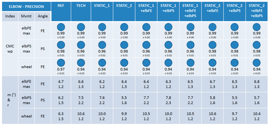 When examining the CMCwp index, the precision of the nine calibrations was very good for the elbow FE angle during the elbFEmax and wheel movements and for the forearm PS angle during the elbPSmax (0.94 ≤ CMCip ≤ 0.99) (Figure 8). When examining the m and r indexes, very good precision could also be observed for all the calibrations, with indexes m and r in the ranges [5.5°–10.6°] and [1.2–2.3], respectively, for all the angles inspected. No particular difference could be observed between the calibrations when examining all the indexes, except m and r values were better for calibrations composed of STATIC_2 for PS angles during elbPSmax (Figure 8).
