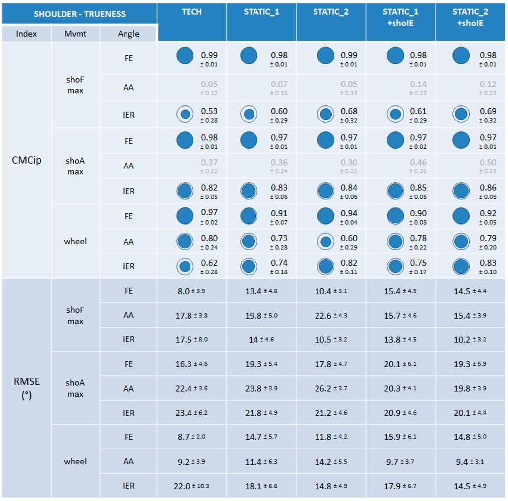 The results on trueness for the shoulder joint. CMCip and RMSE values are reported for the different calibrations during the maximal shoulder flexion (shoFmax), maximal shoulder abduction in the scapular plane (shoAmax), and wheel movements. For visual clarity, the CMCip value is completed with a proportional blue disc included in a blue circle that represents the optimal value 1.