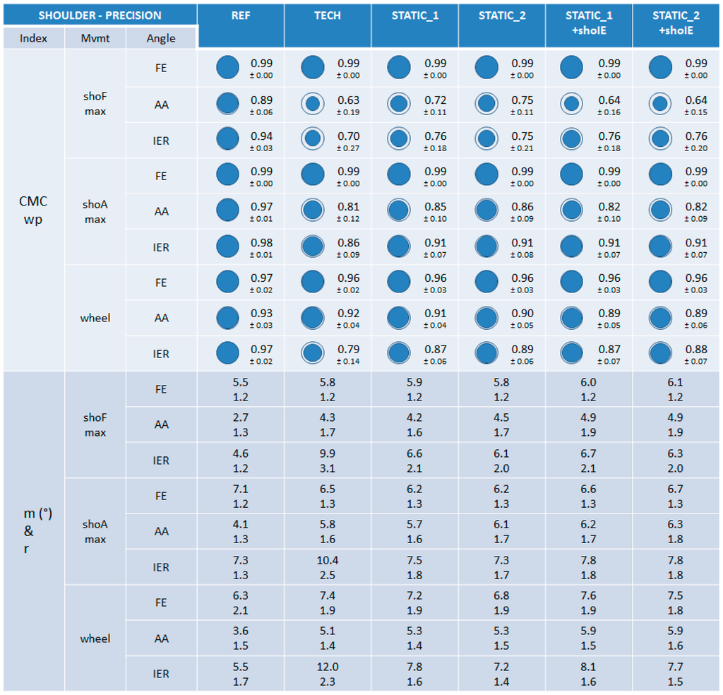 The results on precision for the shoulder joint. CMCwp, m, and r values are reported for the different calibrations and for the REF method during maximal shoulder flexion (shoFmax), maximal shoulder abduction in the scapular plane (shoAmax), and wheel movements. For visual clarity, the CMCwp value is completed with a proportional blue disc included in a blue circle that represents the optimal value 1.