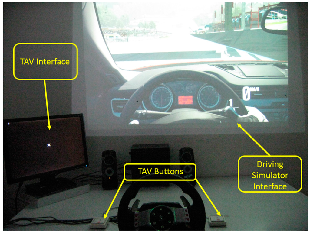 In order to achieve the aims of the study, the driving simulation scene was set to the night condition, which was consistent with the real experiment time. In fact, all the experiments were performed between 6 p.m. and 9 p.m., because people are more likely to become tired during this time after daytime work. The selected car was the Alfa Romeo—Giulietta QV (1750TBi, 4 cylinders, 235 HP) and the experimental circuit chosen was the Spa–Francorchamps route (Belgium). The experimental protocol included EEG baseline recordings (Eyes Opened—OA; Eyes Closed—OC) and eight driving conditions (WUP, PERF, TAV3, TAV1, TAV5, TAV2, TAV4 and DROWSY). For each condition, subjects were asked to drive two laps of the circuit along the selected track. In the WUP (Warm-Up) condition, subjects drove without any requirements, while in the PERF (Performance) condition, subjects were asked to reduce the total time by 2% of the previous total time without committing mistakes (e.g., off-road driving). In the TAVx conditions, the subjects had to keep track of the total time taken in the PERFO conditions and, at the same time, to execute the Task of Alert and Vigilance—TAV (see Section 2.2 for more details). The different levels of the TAV have been used to modulate the difficulty of the global task, and it consists of an alert visual stimulus and a vigilance acoustic stimulus. The difference among the five TAV’s levels consisted in the stimulus rate, which is represented by the number x, from 1 (EASY) to 5 (HARD). The sequence of TAVx conditions was proposed randomly to the subjects to avoid any expectation and habituation effects. In the last experimental condition (DROWSY), subjects were asked to drive as in urban centers, that is around a speed limit of 50 km/h. Such monotonous driving conditions were used to induce the drowsy state. After each condition, subjects had to fill out the NASA-Task Load Index (NASA-TLX) and the Karolinska Sleepiness Scale (KSS) form to collect subjective evaluations of the task workload and driver’s sleepiness [31].