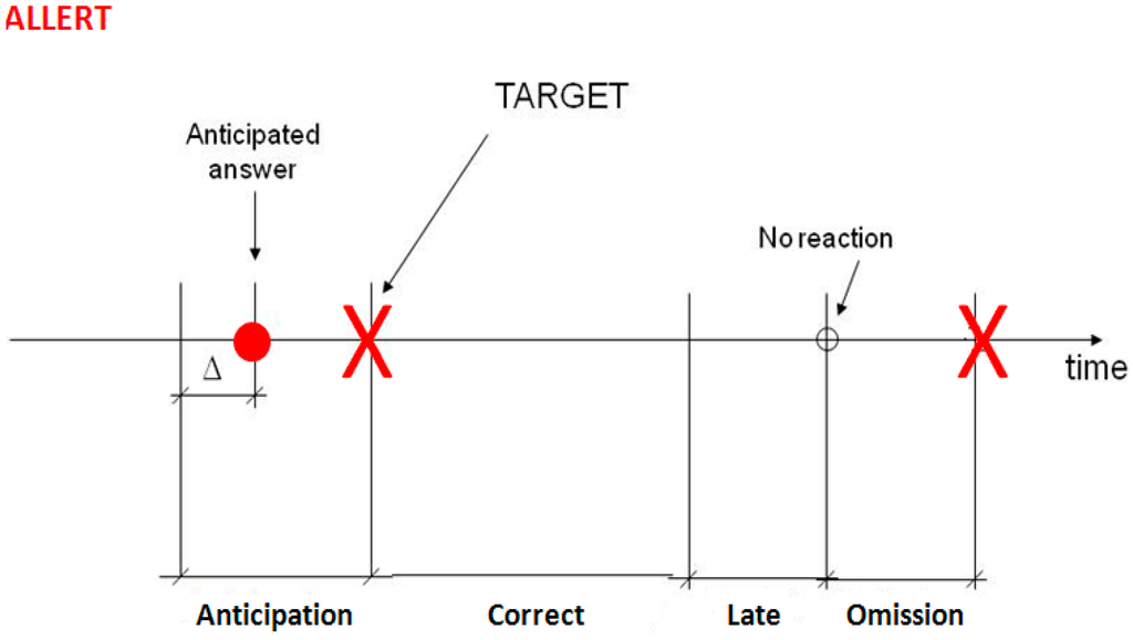 Figure 2. Alert task: The TARGET is the stimulus shown on the screen and the subject has to answer to it as soon as possible. The possible reaction times could be: early, correctly, late or no answer.