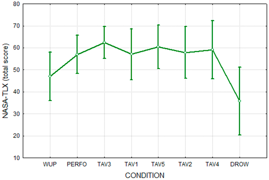 Figure 4. NASA-TLX total score related to the different experimental conditions.