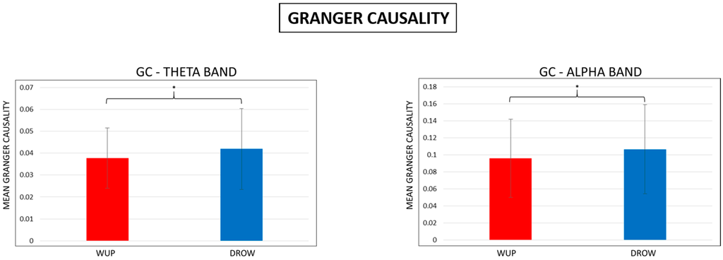 In order to check the differences between the WUP and DROW, average values of the GC have been estimated by the spectral GC matrices, and, successively, the four EEG bands in the two conditions were statistically compared. From the t-tests analyses, significant results have been found in the theta and alpha bands (Figure 6). In both the bands, the GC estimated for the DROW (blue bar) was significantly higher than the GC in the WUP (red bar).